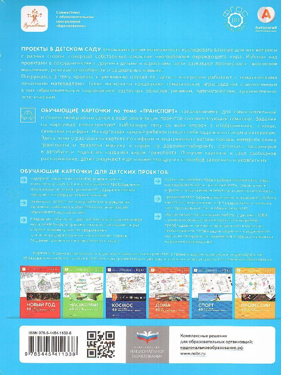 ОБУЧАЮЩИЕ КАРТОЧКИ по теме «ТРАНСПОРТ» предназначены для самостоятельной и совместной работы детей в ходе реализации проектов соответствующей тематики. Задания на карточках иллюстрируют выбранную тему со всех сторон в изображениях, словах, символах и цифрах. На карточках каждый ребенок найдет себе задания по силам и интересам. Здесь можно раскрасить картину по цифрам и заштриховать вагоны поезда, измерить длину транспорта и привести машину в гараж по дорожке-лабиринту, сосчитать пассажиров в автобусе и подписать названия видов транспорта. Получив карточки в свое свободное распоряжение, дети придумают еще множество других способов заполнить и украсить их.Характеристики