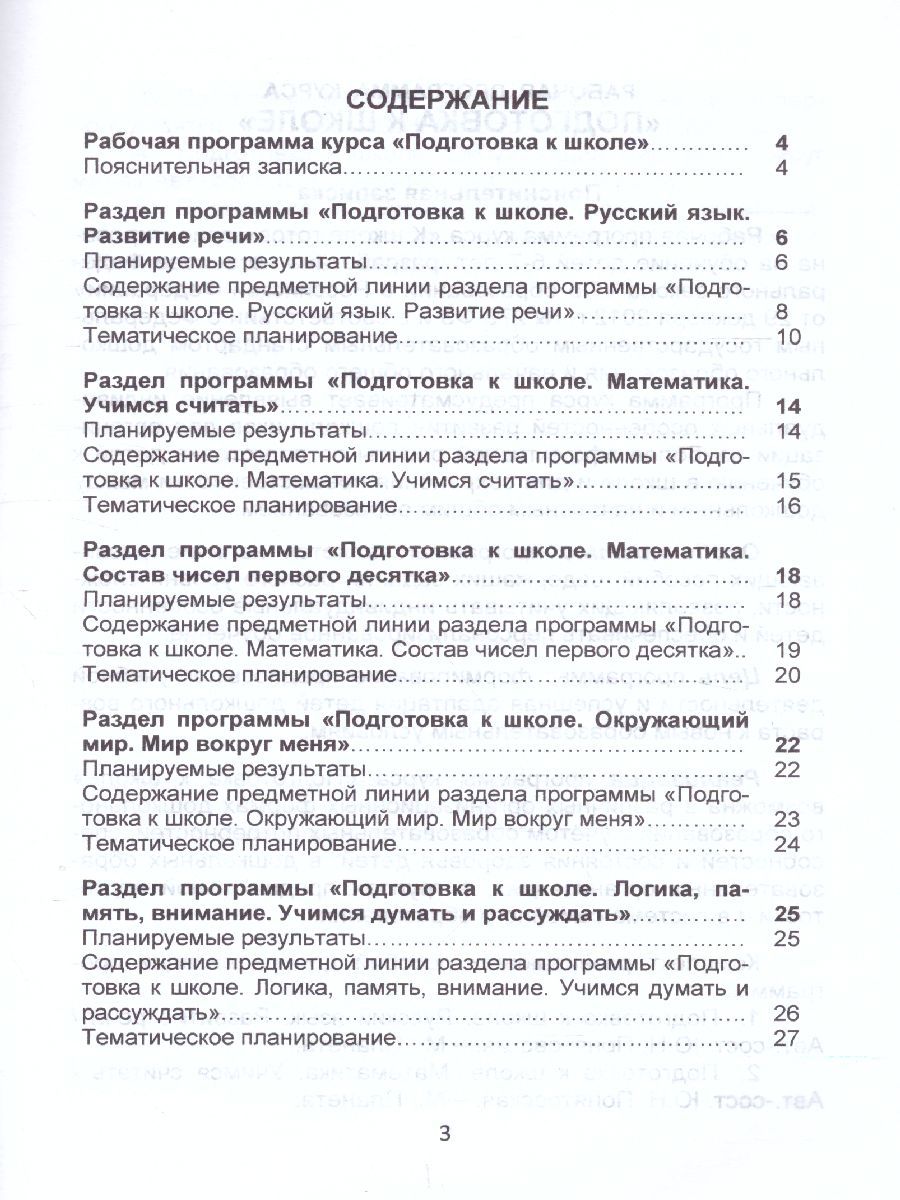 В пособии даны методические рекомендации для педагогов, занимающихся вопросами подготовки детей к обучению в школе. Программа включает в себя следующие разделы: Подготовка к школе. Русский язык. Развитие речи; Подготовка к школе. Математика. Учимся считать; Подготовка к школе. Математика. Состав чисел первого десятка; Подготовка к школе. Окружающий мир. Мир вокруг нас; Подготовка к школе. Логика, память, внимание. Учимся думать и рассуждать. Для каждого раздела в пособии представлены планируемые результаты, содержание предметной линии раздела, тематическое планирование. Книга адресована учителям начальных классов общеобразовательных организаций, воспитателям ДОО, методистам, слушателям курсов повышения квалификации, студентам педагогических вузов.Характеристики