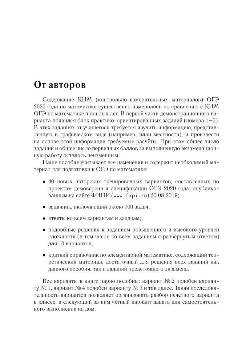 Учебно-методическое пособие предназначено для подготовки к ОГЭ по математике в 2020 году. Книга содержит: • 40 новых авторских тренировочных вариантов, составленных по проектам демоверсии и спецификации ОГЭ-2020 по математике, опубликованным на сайте в августе 2019 года; • пошаговые решения к заданиям с развёрнутым ответом для 10 вариантов; • задачник, содержащий около 700 задач; • ответы ко всем вариантам и заданиям; • краткий теоретический справочник. Выполняя предлагаемые в книге тренировочные варианты,можно сдать ОГЭ по математике на высокий балл. Пособие предназначено выпускникам 9-х классов, а также учителям, осуществляющим подготовку к ОГЭ.Характеристики