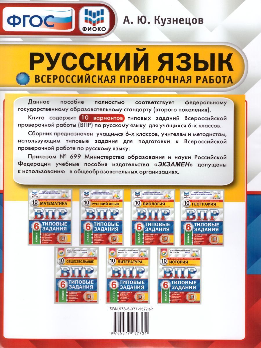 ВПР Русский язык 6 класс 10 вариантов. Типовые задания. ФГОС