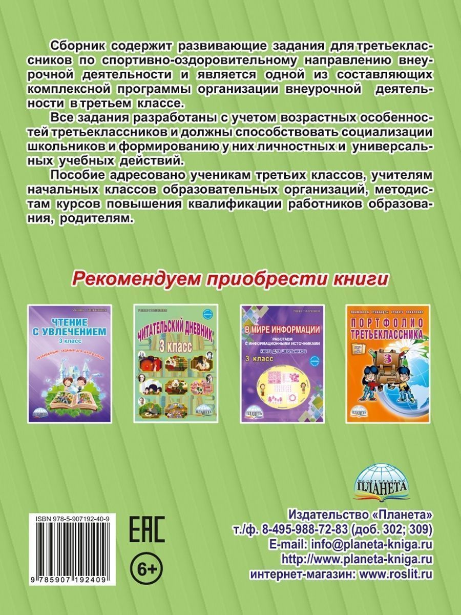 Сборник содержит развивающие задания для третьеклассников по спортивно-оздоровительному направлению внеурочной деятельности и является одной из составляющих комплексной программы организации внеурочной деятельности в третьем классе. Все задания разработаны с учетом возрастных особенностей третьеклассников и должны способствовать социализации школьников и формированию у них личностных и универсальных учебных действий. Пособие адресовано ученикам третьих классов, учителям начальных классов образовательных организаций, методистам курсов повышения квалификации работников образования, родителям.Характеристики