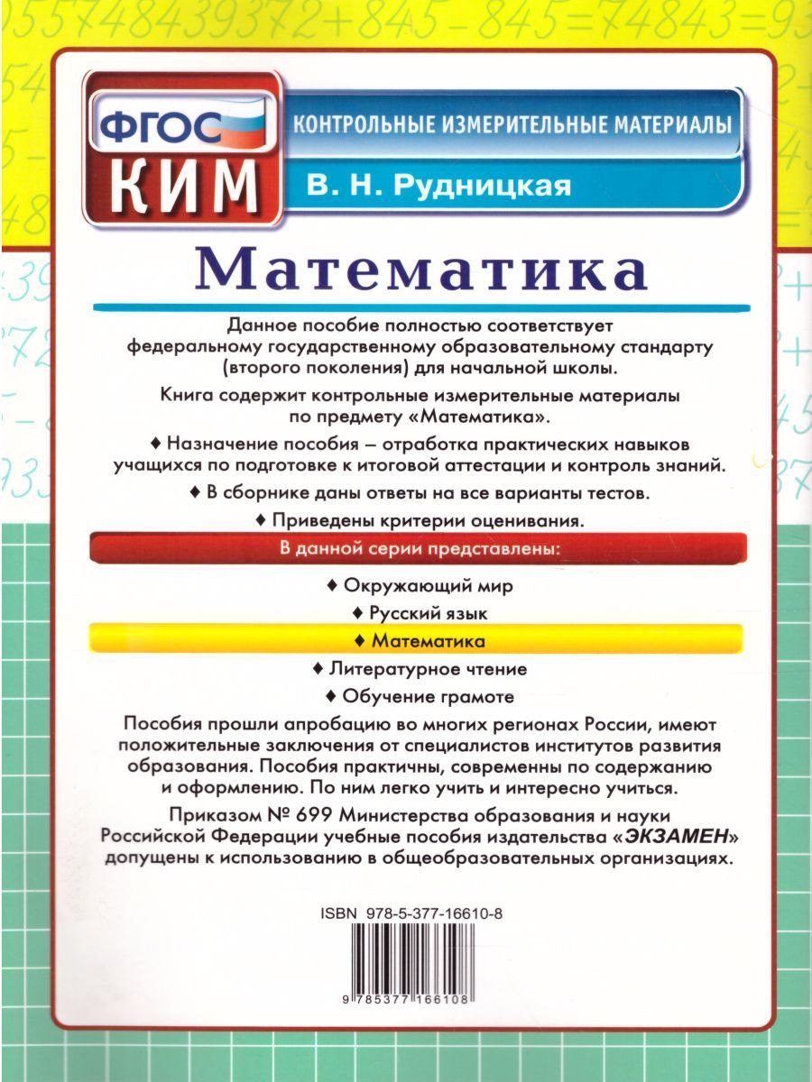 Данное пособие полностью соответствует федеральному государственному образовательному стандарту (второго поколения) для начальной школы. Книга содержит контрольно-измерительные материалы по предмету "Математика". Назначение пособия - отработка практических навыков учащихся по подготовке к итоговой аттестации и контроль знаний. В сборнике даны ответы на все варианты тестов. Приведены критерии оценивания. 11-е издание, переработанное и дополненное.Характеристики