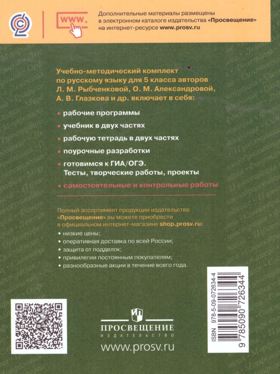 Учебное пособие входит в УМК по русскому языку для 5 класса авторов Л. М. Рыбченковой, О. М. Александровой, О. В. Загоровской и др. Оно поможет ученикам проверить и закрепить знания, полученные на уроках, и подготовиться к промежуточной аттестации в форме Всероссийской проверочной работы. Разнообразие представленных заданий способствует совершенствованию орфографической и пунктуационной зоркости, закрепляет навыки выполнения различных видов разбора. Также данное пособие содержит ответы (ключи) к самостоятельным и контрольным работам. Книга адресована педагогам, школьникам для проверки и самопроверки достижений требований образовательного стандарта по русскому языку к уровню подготовки учащихся основной школы.Характеристики