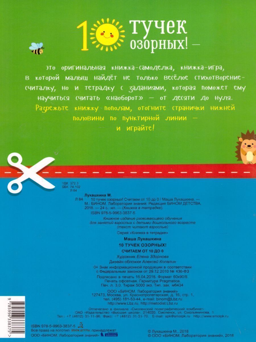 В тетрадках этой серии малышей и их родителей ждет приятный сюрприз. Чтобы его получить, от взрослых требуется совсем немного - взять острые ножницы и аккуратно сделать надрезы по пунктирным линиям. И тетрадка сразу превратится в удивительную игру. Вверху страницы малыш выполняет задания на счет, рисует, раскрашивает, обводит, а внизу читает веселое стихотворение и играет в игру "доскажи словечко!". Отличный способ научиться считать до десяти в любом возрасте! Когда все задания выполнены и все картинки нарисованы, тетрадка просто разрезается пополам и малышу на память остается маленькая книжечка с волшебными страничками, которую можно сохранить в семейной библиотеке. В серии: Веселый таксопарк, 10 тучек озорных, Собираем урожай, Азбука Бабы-Яги, Разноцветные дракончики.Характеристики