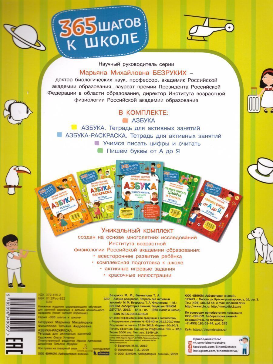 Как просто научить ребенка читать, считать и писать? Как подготовить к школе вашего малыша всего за 15 минут в день? Как научить замечать буквы и цифры вокруг? Комплект-бестселлер «365 шагов к школе» — это уникальная Азбука подготовки к школе! Занимаясь по 15 минут в день, вскоре ребенок научится читать, писать, считать и мыслить! Зачем покупать комплект: «Азбука-раскраска» — это одно из пяти пособий серии. Она содержит разнообразные тематические развороты для раскрашивания. Каждая буква, которую вы прошли с ребенком по «Азбуке», закрепляется в раскраске. А еще ребенок получает новую информацию о мире и узнает ключевые слова темы. Заниматься по «Азбуке» эффективнее всего комплексно. Одинаковая последовательность и свои задания для каждой из букв в Азбуке и 4-х тетрадей упрощают подготовку ребёнка к школе. Малыш легче выучит буквы, научится их читать, писать и находить в словах, а также подготовит руку к письму. Например, вы вместе изучаете букву А, затем открываете «Тетрадь для активных занятий», потом выполняете задания в «Азбуке-раскраске» и разрабатываете руку к письму вместе с тетрадью «Пишем буквы от А до Я». А тетрадь «Учимся писать цифры и считать» поможет ребёнку весело усвоить цифры и счёт. Вот три простых совета для занятий по «Азбуке»: 1. Всего 15 минут занятий в день с «Азбукой» сохраняют концентрацию ребенка и помогут научить его мыслить и наблюдать. 2. Не нужно настаивать! Просто играйте в задания «Азбуки» вместе с малышом. И сами не заметите, как он начнёт читать и писать. 3. Сразу в дело! Знакомьте ребенка с буквой, соберите ее из скрепок или пуговиц, обсудите размеры заглавной и строчной буквы, найдите ее в слове, а потом отыщите ее на тематических страницах всех 4-х дополнительных тетрадей «Азбуки». Об авторе: Все задания Азбуки – результат многолетнего опыта и исследований Марьяны Безруких в институте возрастной физиологии РАО. Марьяна Михайловна – доктор биологических наук, профессор, академик Российской академии образования. За «365 шагов» с 5 пособиями Азбуки любой ребёнок будет полностью готов к школе! 5 причин купить: 1. Это настоящий экспресс-курс для подготовки к школе. Вам не нужны будут другие пособия. 2. Серия создана на основе многолетних исследований Института физиологии Российской академии образования. 3. В комплекте 5 книг, которые помогут максимально всесторонне подготовить ребенка к школе. 4. Научный руководитель серии Марьяна Безруких — доктор биологических наук и академик Российской академии образования. 5. После «Азбуки» ребенок: научится читать, писать, считать, а самое главное — загорится желанием учиться в школе.Характеристики