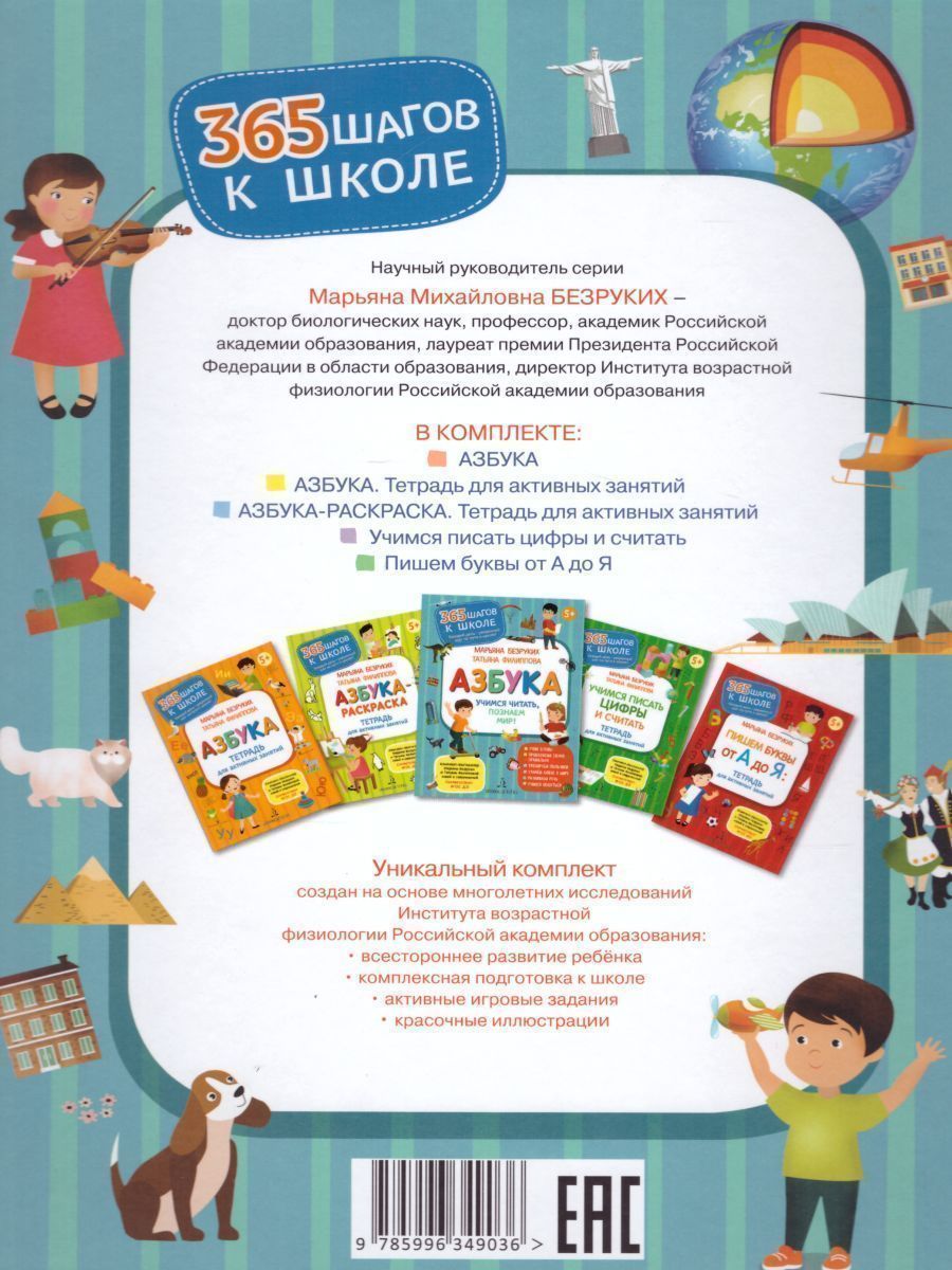Как просто научить ребенка читать, считать и писать? Как подготовить к школе вашего малыша всего за 15 минут в день? Как научить замечать буквы и цифры вокруг? Комплект-бестселлер «365 шагов к школе» — это уникальная Азбука экспресс-подготовки к школе! Занимаясь по 15 минут в день, вскоре ребенок научится читать, писать, считать и мыслить! Зачем нужен комплект? «Азбука» — это основная книга в серии. Скороговорки, пальчиковая гимнастика, артикуляционные упражнения, истории, раскраски, разнообразные задания и тематические листы помогают знакомить с буквами и цифрами, закрепляют их зрительно, ориентируют в пространстве и развивают зрительную память. А также знакомят малыша с окружающим миром. Заниматься по «Азбуке» эффективнее всего комплексно. Одинаковая последовательность и свои задания для каждой из букв в Азбуке и 4-х тетрадей упрощают подготовку ребёнка к школе. Малыш легче выучит буквы, научится их читать, писать и находить в словах, а также подготовит руку к письму. Например, вы вместе изучаете букву А, затем открываете «Тетрадь для активных занятий», потом выполняете задания в «Азбуке-раскраске» и разрабатываете руку к письму вместе с тетрадью «Пишем буквы от А до Я». А тетрадь «Учимся писать цифры и считать» поможет ребёнку весело усвоить цифры и счёт. Вот три простых совета для занятий по «Азбуке»: 1. Всего 15 минут занятий в день с «Азбукой» сохраняют концентрацию ребенка и помогут научить его мыслить и наблюдать. 2. Не нужно настаивать! Просто играйте в задания «Азбуки» вместе с малышом. И сами не заметите как он начнёт читать и писать. 3. Сразу в дело! Знакомьте ребенка с буквой, соберите ее из скрепок или пуговиц, обсудите размеры заглавной и строчной буквы, найдите ее в слове, а потом отыщите ее на тематических страницах всех 4-х дополнительных тетрадей «Азбуки». Об авторе: Все эти задания – результат многолетнего опыта и исследований РАО Марьяны Безруких в институте возрастной физиологии. Марьяна Михайловна – доктор биологических наук, профессор, академик Российской академии образования. За «365 шагов» с 5 пособиями Азбуки любой ребёнок будет полностью готов к школе! 5 причин купить: 1. Это настоящий экспресс-курс для подготовки к школе. Вам не нужны будут другие пособия. 2. Серия создана на основе многолетних исследований Института физиологии Российской академии образования. 3. В комплекте 5 книг, которые помогут максимально всесторонне подготовить ребенка к школе. 4. Научный руководитель серии Марьяна Безруких — доктор биологических наук и академик Российской академии образования. 5. После «Азбуки» ребенок: научится читать, писать, считать, а самое главное — загорится желанием учиться в школе.Характеристики