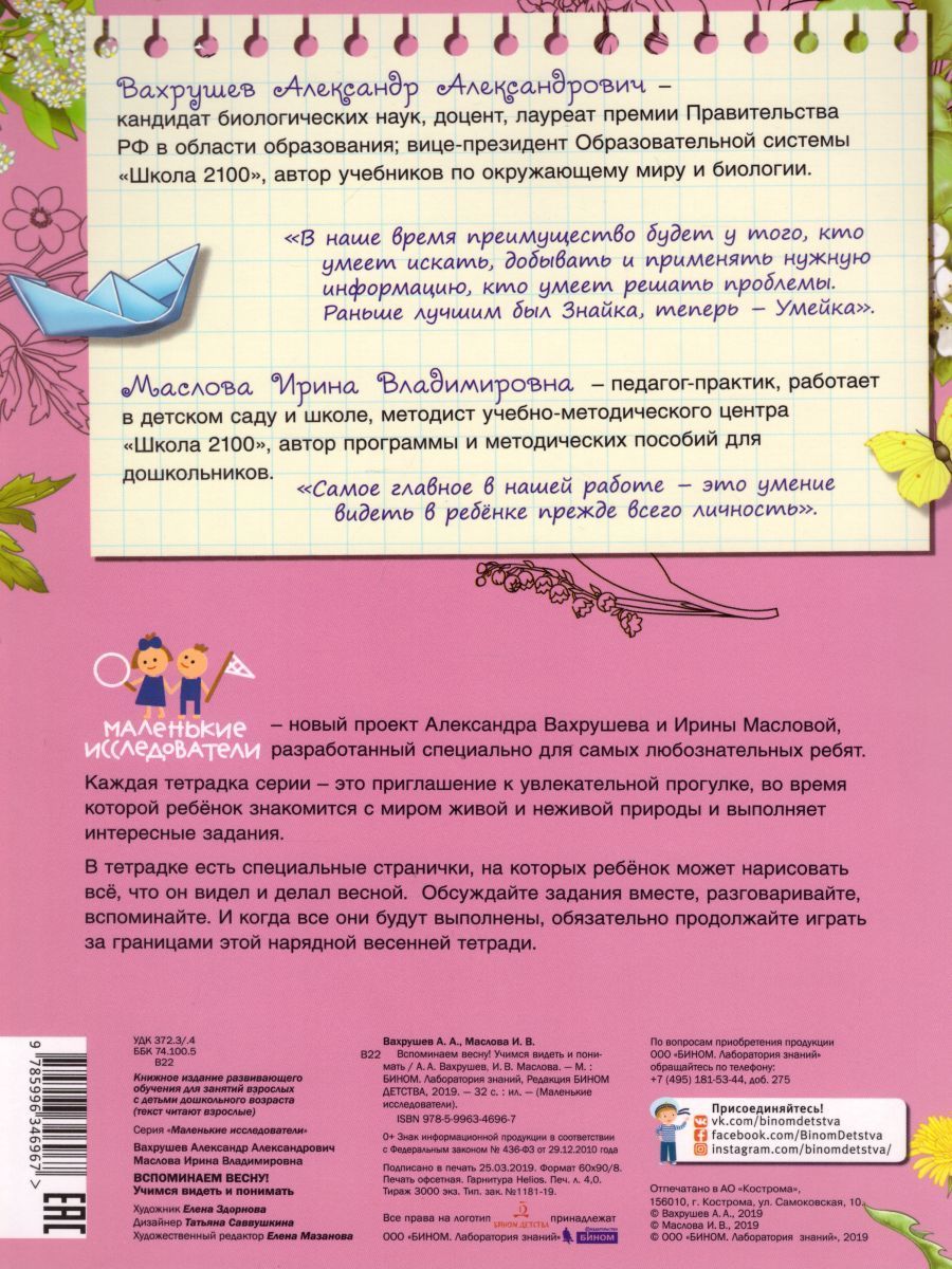 «Маленькие исследователи» – новый проект Александра Вахрушева и Ирины Масловой, разработанный специально для самых любознательных ребят. Каждая тетрадка – это приглашение к увлекательной прогулке, во время которой ребёнок знакомится с миром живой и неживой природы. Серию отличает выверенность заданий, их точное соответствие заявленному возрасту. Выполняя их, ребёнок совершает самые настоящие открытия. И всё это в игровой форме, как и должно быть в дошкольном детстве. Вспоминая зиму, ребята раскрашивают, лепят и рисуют, проводят увлекательные эксперименты, подбирают наклейки. Мы вспомним, как собирали урожай, исследуем воду и ветер, изучим осенние листья, животных и птиц и собираем грибы. На страницах тетради оживут птицы, деревья и даже стихи! В тетрадке есть осенний подарок – красивые открытки из листьев, которые можно сделать своими руками! Обсуждайте задания вместе, разговаривайте, вспоминайте. И когда все они будут выполнены, обязательно продолжайте игру в осень за границами этой нарядной тетради.Характеристики