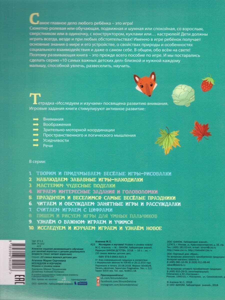 Самое главное дело любого ребёнка — это игра! Сюжетно-ролевая или обучающая, подвижная и шумная или спокойная, со взрослым, сверстником или в одиночку, с конструктором, куклами или… кастрюлей! Дети должны играть всегда, везде и при любых обстоятельствах! Именно в игре ребёнок получает основные знания о мире и его устройстве, о свойствах природы и особенностях социального взаимодействия и даже о самом себе. В общем, обо всём на свете! Поэтому любая развивающая тетрадка или книга — это прежде всего пособие по игре. И мы постарались сделать серию «10 самых важных детских дел» близкой и нужной каждому малышу, способной увлечь, развеселить, научить. Приобретая комплект из 10 тетрадей, вы получаете более 200 заданий на все виды детской деятельности. Это целый курс всестороннего развития ребёнка! Тетрадка «Играем!» посвящена развитию мышления. Десять важных дел живут прекрасно вместе Десять важных дел – все важное на месте: Мастерим, творим, читаем, наблюдаем и играем Изучаем, веселимся, пишем, узнаём, считаем. У ребенка все на месте, если вся «десятка» вместе!Характеристики