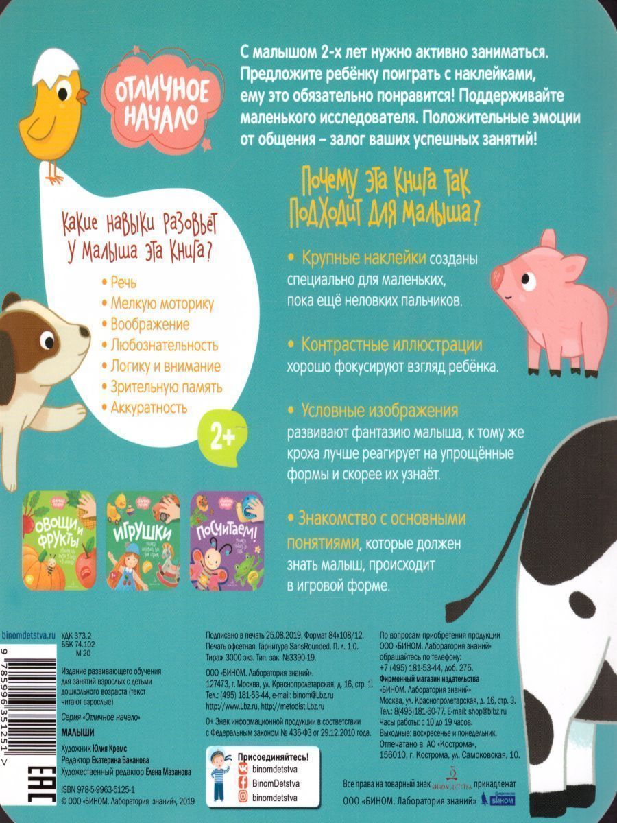 Что интересно малышу 2-х лет? Как начать заниматься с такой крохой? Это знает мама. Книжечки серии «Отличное начало» созданы такими мамами, которые знают, как удовлетворить любознательность маленького исследователя. Ведь мамы создавали это для своих малышей. Задания с яркими наклейками точно понравятся крохам. А положительные эмоции от картинок – это залог успешных занятий. Что внутри? «Кря-Кря! Куд-куда!» Знакомимся с детёнышами домашних животных. Крупные, контрастные картинки хорошо фиксируют взгляд ребенка. А условные изображения животных развивают фантазию малыша. Кроха лучше реагирует на упрощённые формы и быстрее их узнаёт. Крупные наклейки созданы специально для маленьких пока ещё неловких пальчиков. О серии: «Отличное начало» — это первые уроки для малышей. Яркие картинки, большие наклейки помогают развить мелкую моторику, воображение, речь, любознательность, логику и внимание, зрительную память и аккуратность. Об авторах: Эту книгу специально для молодых мам создали сами молодые мамы современных малышей. 5 причин купить: 1. Эта книжка, которую придумали молодые мамы для своих малышей. 2. Крупные картинки и шрифт — отлично подходят для первого знакомства со словами. 3. Круглые наклейки для каждой страницы: добавляют интерес и пользу занятиям. 4. Небольшой формат — удобно взять в дорогу или на прогулку. 5. Разработана молодыми мамами для современных малышей!Характеристики