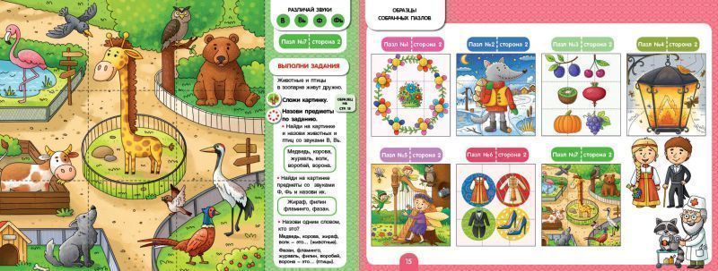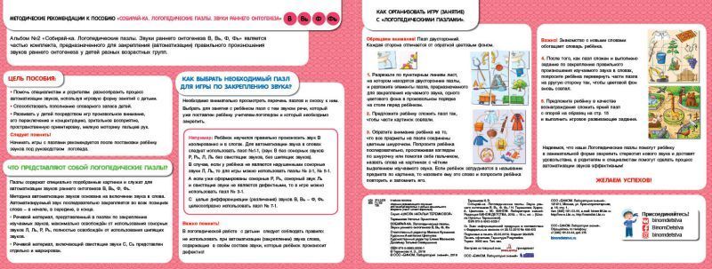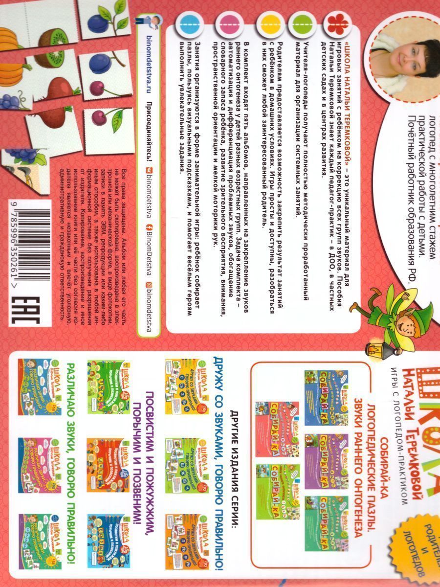 Как научить ребёнка грамотной речи, а в дальнейшем грамотному письму? Как научить его различать сложные звуки? В этом поможет альбом разрезных логопедических пазлов «Собирай-ка» из серии «Школа Натальи Теремковой» — уникальный материал для игровых занятий с ребёнком по закреплению (автоматизации) и различению (дифференциации) звуков раннего онтогенеза у детей разных возрастных групп. Альбом входит в комплект из 5-ти 16-страничных изданий, которые охватывают весь спектр проблемных звуков. Цель комплекта: способствовать пополнению словарного запаса детей, развить у детей посредством игр произвольное внимание, его переключения, а также концентрацию зрительного восприятия, пространственную ориентировку и мелкую моторику пальцев рук. О чём альбом? Трудно представить успешного человека, речь которого невнятна, который не выговаривает половину звуков. Такому человеку придется приложить намного больше усилий, чтобы добиться успеха в жизни. Поэтому так важно научиться говорить правильно с детства. Исправить даже самые сложные звуки В, Вь, Ф, Фь можно! Если работать над ними в игровой форме. Именно такие занятия Наталья Теремкова предлагает родителям и педагогам в новом альбоме. Каждый комплект — это Альбом из 16 ламинированных страниц. На каждой странице – обучающие пазлы для закрепления или различения звуков, а также пазлы для вознаграждения ребёнка. 70 специально подобранных двусторонних картинок-пазлов, а также развивающие картинки помогут привлечь внимание ребенка к изучаемому звуку, активируют память, звуковое, зрительное восприятие и способствуют самостоятельному произнесению фраз. Такие игровые задания легко побуждают самого ребёнка участвовать в процессе исправления звукопроизношения. Для родителей. Чем раньше обратить внимание на искаженное произношение звуков у ребенка, тем легче исправить эти недостатки речи. Правильно подобранные логопедом-практиком предметные картинки позволяют закрепить произношение сначала в слогах, затем в словах и в сочетаниях слов, предложениях и связной речи. Звуки закрепляются во всех позициях — в начале, в середине и в конце слов. Обратите внимание! При выборе пазлов выбирайте тот звук или звуки, которые нуждаются в автоматизации (закреплении). Обращайте внимания на рекомендации вашего логопеда. Не используйте слова и фразы, содержащие другие звуки, которые ребенок произносит дефектно! О СЕРИИ Вот уже 20 лет малыши в детских садах учатся правильно произносить звуки вместе с пособиями автора-логопеда Натальи Теремковой. Комплект серии «Школа Натальи Теремковой» мы разработали специально для закрепления и различения ребенком уже поставленных звуков вместе с логопедом или дома, с родителями. Учителя-логопеды получают полностью методически проработанный материал для организации системных занятий. Родителям предоставляется возможность закрепить результат занятий с ребёнком в домашних условиях. Игры просты и доступны, разобраться в них сможет любой заинтересованный родитель. В серии представлены 5 альбомов: «Собирай-ка. Логопедические пазлы. Звуки раннего онтогенеза В, Вь, Ф, Фь» «Собирай-ка. Логопедические пазлы. Звуки раннего онтогенеза М, Мь, Н, Нь» «Собирай-ка. Логопедические пазлы. Звуки раннего онтогенеза Д, Дь, Т, Ть» «Собирай-ка. Логопедические пазлы. Звуки раннего онтог