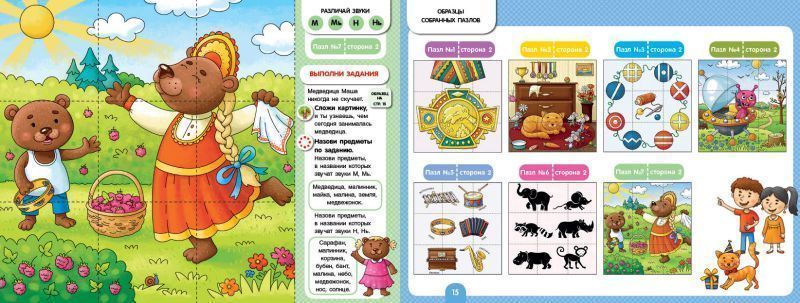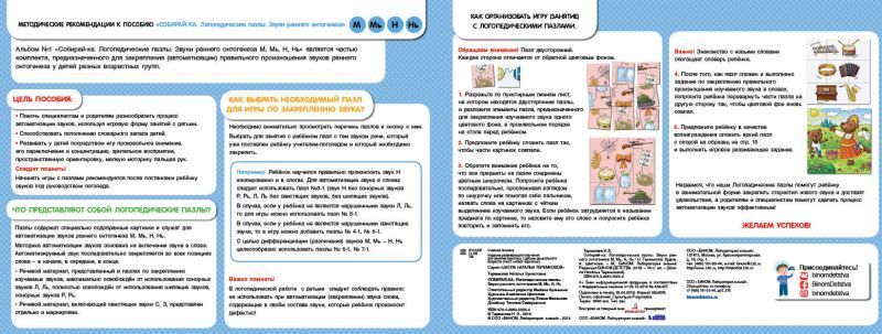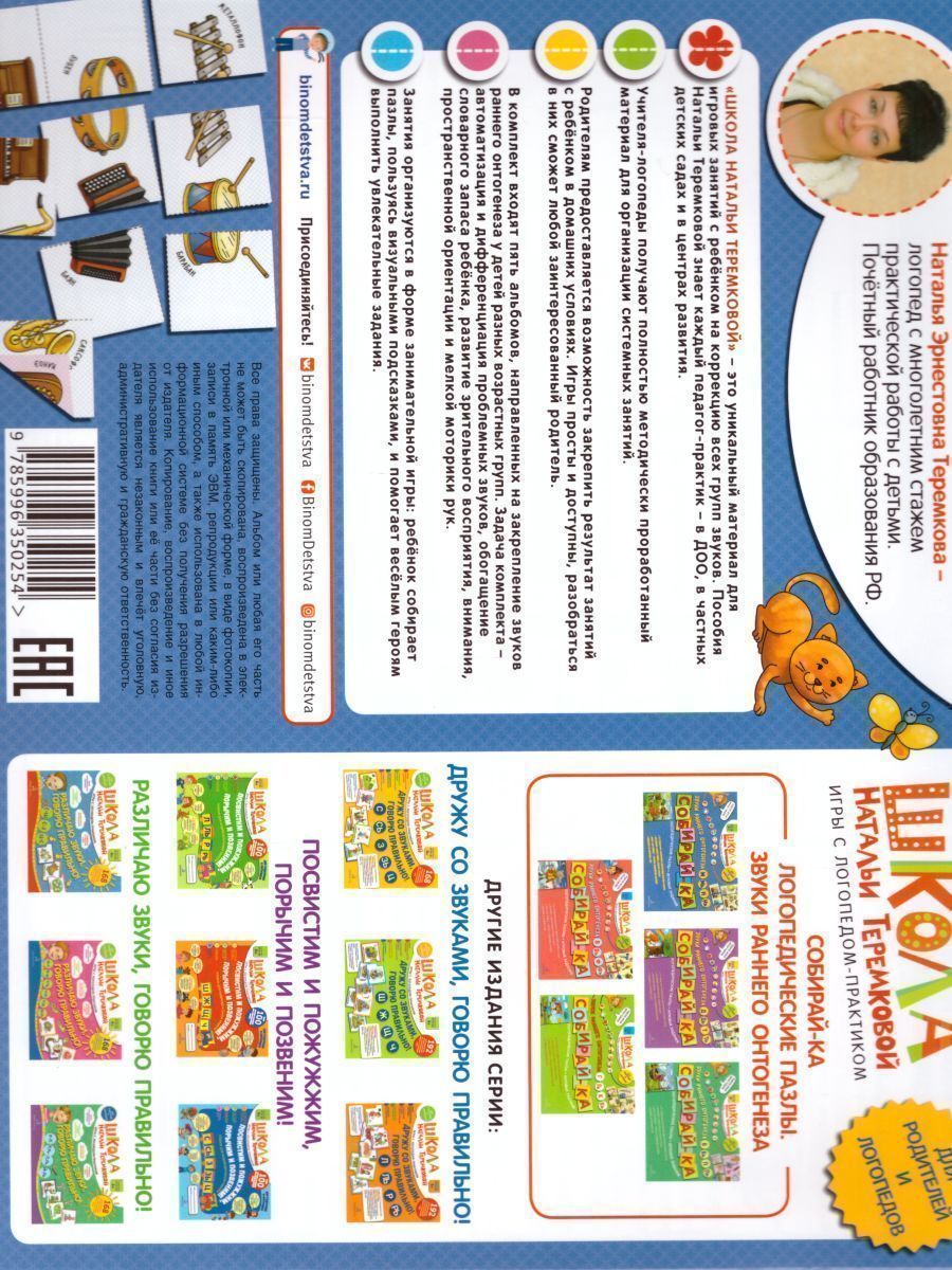 Как научить ребёнка грамотной речи, а в дальнейшем грамотному письму? Как научить его различать сложные звуки? В этом поможет альбом разрезных логопедических пазлов «Собирай-ка» из серии «Школа Натальи Теремковой» — уникальный материал для игровых занятий с ребёнком по закреплению (автоматизации) и различению (дифференциации) звуков раннего онтогенеза у детей разных возрастных групп. Альбом входит в комплект из 5-ти 16-страничных изданий, которые охватывают весь спектр проблемных звуков. Цель комплекта: способствовать пополнению словарного запаса детей, развить у детей посредством игр произвольное внимание, его переключения, а также концентрацию зрительного восприятия, пространственную ориентировку и мелкую моторику пальцев рук. О чём альбом? Трудно представить успешного человека, речь которого невнятна, который не выговаривает половину звуков. Такому человеку придется приложить намного больше усилий, чтобы добиться успеха в жизни. Поэтому так важно научиться говорить правильно с детства. Исправить даже самые сложные звуки М, Мь, Н, Нь можно! Если работать над ними в игровой форме. Именно такие занятия Наталья Теремкова предлагает родителям и педагогам в новом альбоме. Каждый комплект — это Альбом из 16 ламинированных страниц. На каждой странице – обучающие пазлы для закрепления или различения звуков, а также пазлы для вознаграждения ребёнка. 70 специально подобранных двусторонних картинок-пазлов, а также развивающие картинки помогут привлечь внимание ребенка к изучаемому звуку, активируют память, звуковое, зрительное восприятие и способствуют самостоятельному произнесению фраз. Такие игровые задания легко побуждают самого ребёнка участвовать в процессе исправления звукопроизношения. Для родителей: Чем раньше обратить внимание на искаженное произношение звуков у ребенка, тем легче исправить эти недостатки речи. Правильно подобранные логопедом-практиком предметные картинки позволяют закрепить произношение сначала в слогах, затем в словах и в сочетаниях слов, предложениях и связной речи. Звуки закрепляются во всех позициях — в начале, в середине и в конце слов. Обратите внимание! При выборе пазлов выбирайте тот звук или звуки, которые нуждаются в автоматизации (закреплении). Обращайте внимания на рекомендации вашего логопеда. Не используйте слова и фразы, содержащие другие звуки, которые ребенок произносит дефектно! О серии: Вот уже 20 лет малыши в детских садах учатся правильно произносить звуки вместе с пособиями автора-логопеда Натальи Теремковой. Комплект серии «Школа Натальи Теремковой» мы разработали специально для закрепления и различения ребенком уже поставленных звуков вместе с логопедом или дома, с родителями. Учителя-логопеды получают полностью методически проработанный материал для организации системных занятий. Родителям предоставляется возможность закрепить результат занятий с ребёнком в домашних условиях. Игры просты и доступны, разобраться в них сможет любой заинтересованный родитель. В серии представлены 5 альбомов: «Собирай-ка. Логопедические пазлы. Звуки раннего онтогенеза В, Вь, Ф, Фь» «Собирай-ка. Логопедические пазлы. Звуки раннего онтогенеза М, Мь, Н, Нь» «Собирай-ка. Логопедические пазлы. Звуки раннего онтогенеза Д, Дь, Т, Ть» «Собирай-ка. Логопедические пазлы. Звуки раннего онто