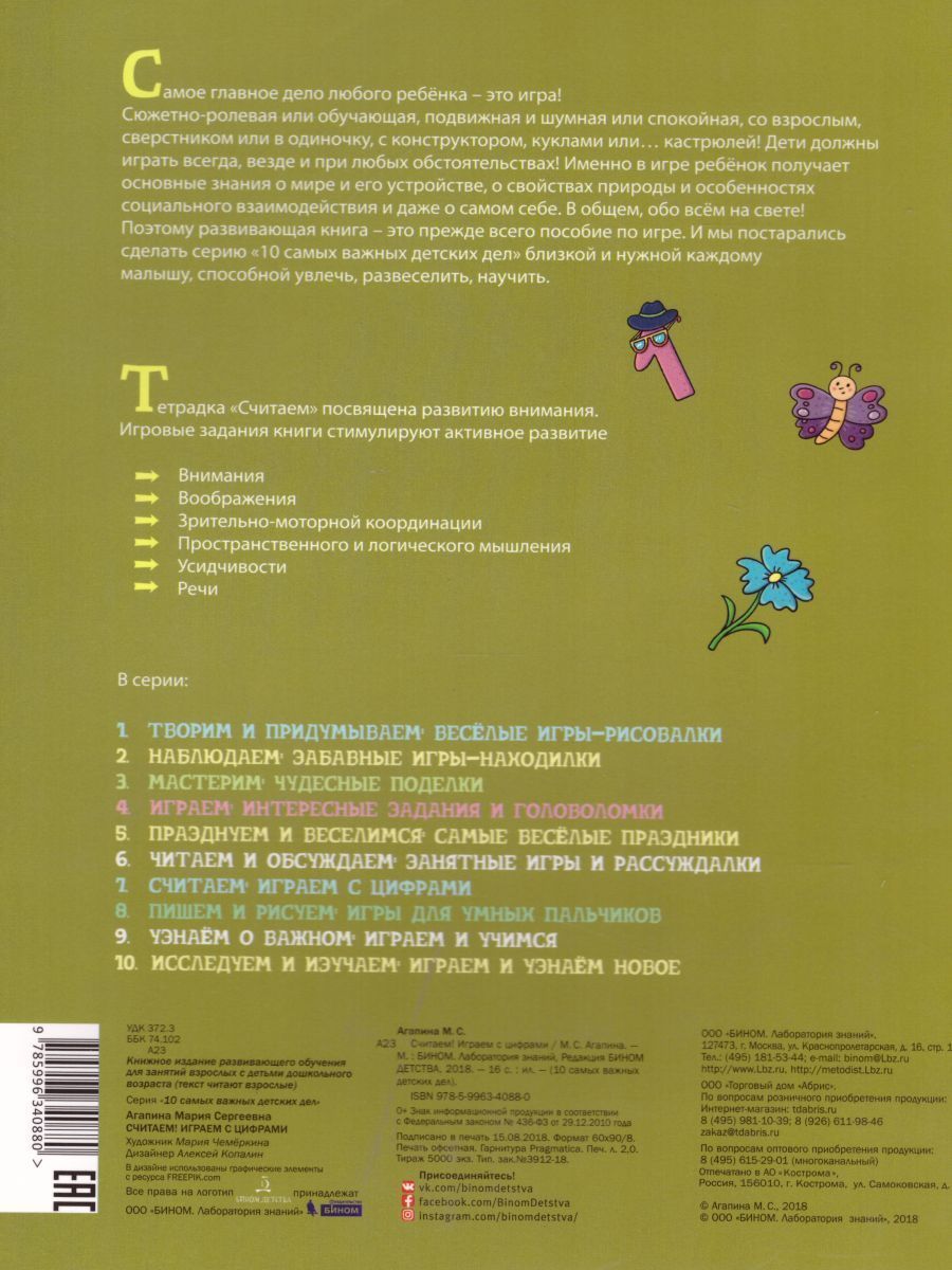 Самое главное дело любого ребёнка — это игра! Сюжетно-ролевая или обучающая, подвижная и шумная или спокойная, со взрослым, сверстником или в одиночку, с конструктором, куклами или… кастрюлей! Дети должны играть всегда, везде и при любых обстоятельствах! Именно в игре ребёнок получает основные знания о мире и его устройстве, о свойствах природы и особенностях социального взаимодействия и даже о самом себе. В общем, обо всём на свете! Поэтому любая развивающая тетрадка или книга — это прежде всего пособие по игре. И мы постарались сделать серию «10 самых важных детских дел» близкой и нужной каждому малышу, способной увлечь, развеселить, научить. Приобретая комплект из 10 тетрадей, вы получаете более 200 заданий на все виды детской деятельности. Это целый курс всестороннего развития ребёнка! Тетрадка «Играем!» посвящена развитию мышления. Десять важных дел живут прекрасно вместе Десять важных дел – все важное на месте: Мастерим, творим, читаем, наблюдаем и играем Изучаем, веселимся, пишем, узнаём, считаем. У ребенка все на месте, если вся «десятка» вместе!Характеристики