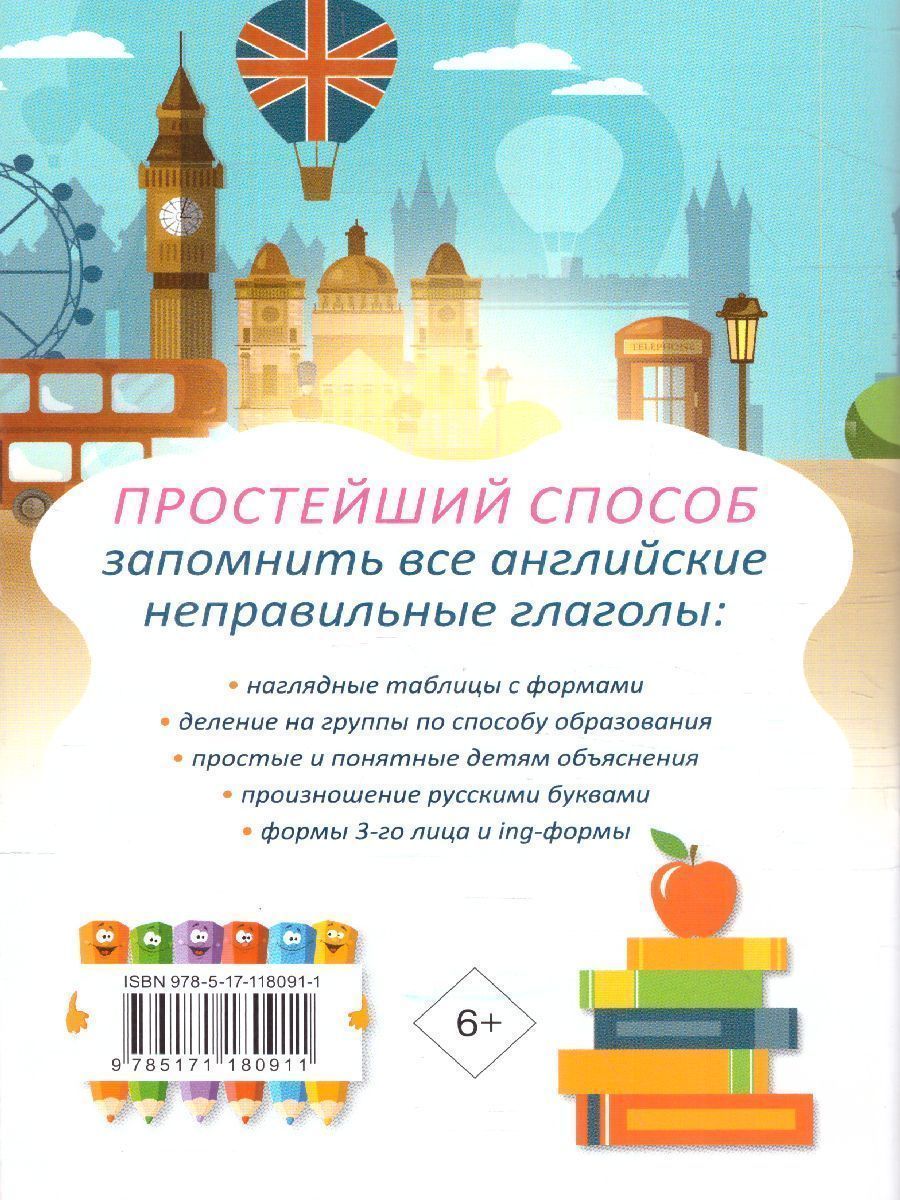 Данный справочник содержит все основные неправильные глаголы английского языка. В издании приведены все три формы глагола с транскрипцией, ударением и переводом. Помимо общего списка дается деление глаголов на группы по способу образования, формы 3-го лица единственного числа и ing-формы, а также задания для закрепления материала. Издание идеально подойдет для учащихся начальной школы и будет полезно для родителей.Характеристики