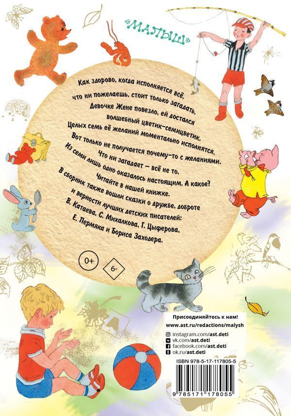 В книгу "Цветик-семицветик. Сказки" вошли сказочные истории для маленького читателя. Цыплёнок и Медвежонок из сказки Г. Цыферова расскажут о своих друзьях и заботах. Маленькие сказки Е. Пермяка научат трудолюбию и поведают о том, как поскорее стать большим. Три поросёнка С. Михалкова на своём примере объяснят, как можно выручить из беды своих братьев и какие стоит строить дома. Вместе с девочкой Женей, счастливой обладательницей волшебного цветика-семицветика, малыши узнают, как правильно загадывать желания, чтобы они приносили настоящую радость. А Отшельник и Роза поделятся своей историей о дружбе и синем-синем море. Рисунки к сказкам нарисовали известные художники детской книги Э. Булатов и О. Васильев. Для младшего школьного возраста.Характеристики