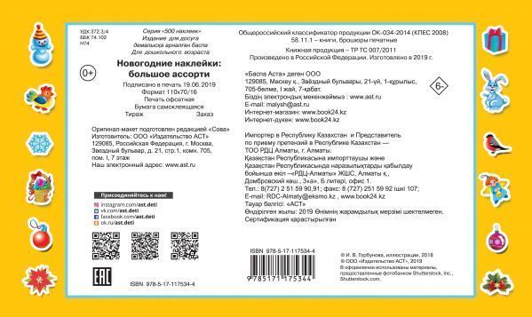 "Большое ассорти новогодних наклеек. 500 наклеек" — эта замечательная книга поможет ребенку интересно и с пользой провести новогодние каникулы. Малыш придумает истории о Дедушке Морозе и Снегурочке, своими руками сделает красочные коллажи. Для дошкольного возраста.Характеристики