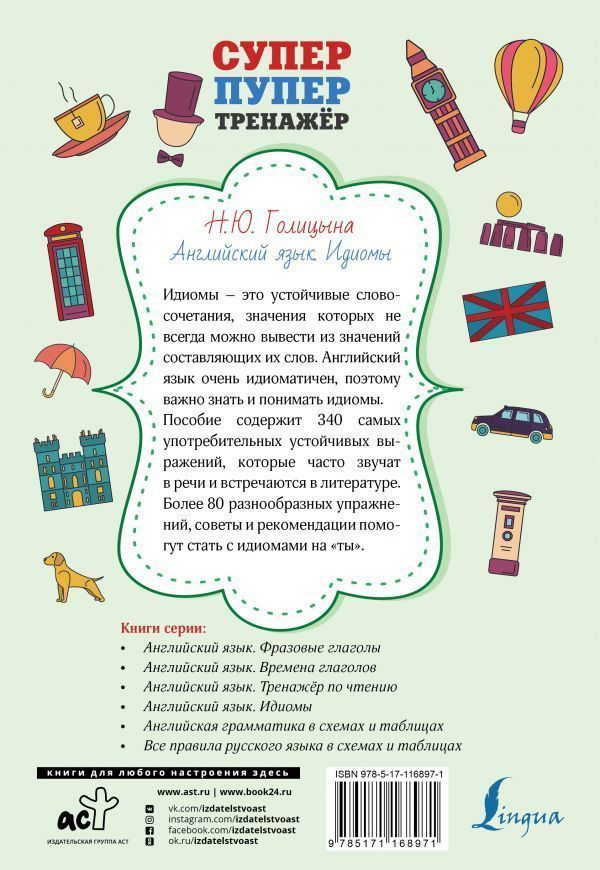 Идиомы – это устойчивые словосочетания, значения которых не всегда можно вывести из значений составляющих их слов. Английский язык очень идиоматичен, поэтому важно знать и понимать идиомы. Пособие содержит 340 самых употребительных устойчивых выражений, которые часто звучат в речи и встречаются в литературе. По мнению автора, более эффективно заучивать идиомы не по темам, а по основному существительному или глаголу, поэтому они даны по основному слову в алфавитном порядке. Более 80 разнообразных упражнений, советы и рекомендации помогут стать с идиомами на "ты". Издание предназначено для всех, кто учит английский язык и стремится к ликвидации белых пятен в своих знаниях.Характеристики