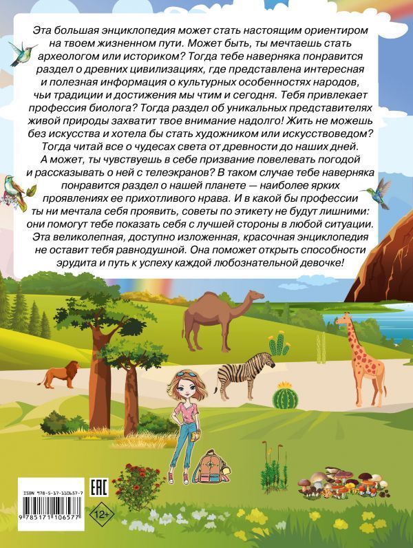 Ты ищешь книгу, в которой тебе рассказали бы о самом загадочном и интересном: о просторах космоса и глубинах океанов, древних цивилизациях и чудесных сооружениях, прекрасных цветах и удивительных животных, правилах этикета и общения? Эта большая энциклопедия - именно то, что нужно! На ее красочных страницах тебя ждут неожиданные открытия. Ты узнаешь много полезной информации о древних народах и традициях прошлого, о природных и рукотворных шедеврах, о богатстве природы и ее могуществе. Благодаря этой книге ты сможешь понять, чем вулкан отличается от гейзера, рассмотреть сооружения человечества от египетских пирамид до современных монументов, представить себя на древнегреческой агоре или античном римском форуме и получить впечатление от увлекательного экскурса в животный и растительный мир. А советы по этикету помогут тебе элегантно справиться с любой неловкой ситуацией. Понятно изложенный материал, дополненный великолепными иллюстрациями, сделает чтение этой книги незабываетмым! Для среднего и старшего школьного возраста.Характеристики