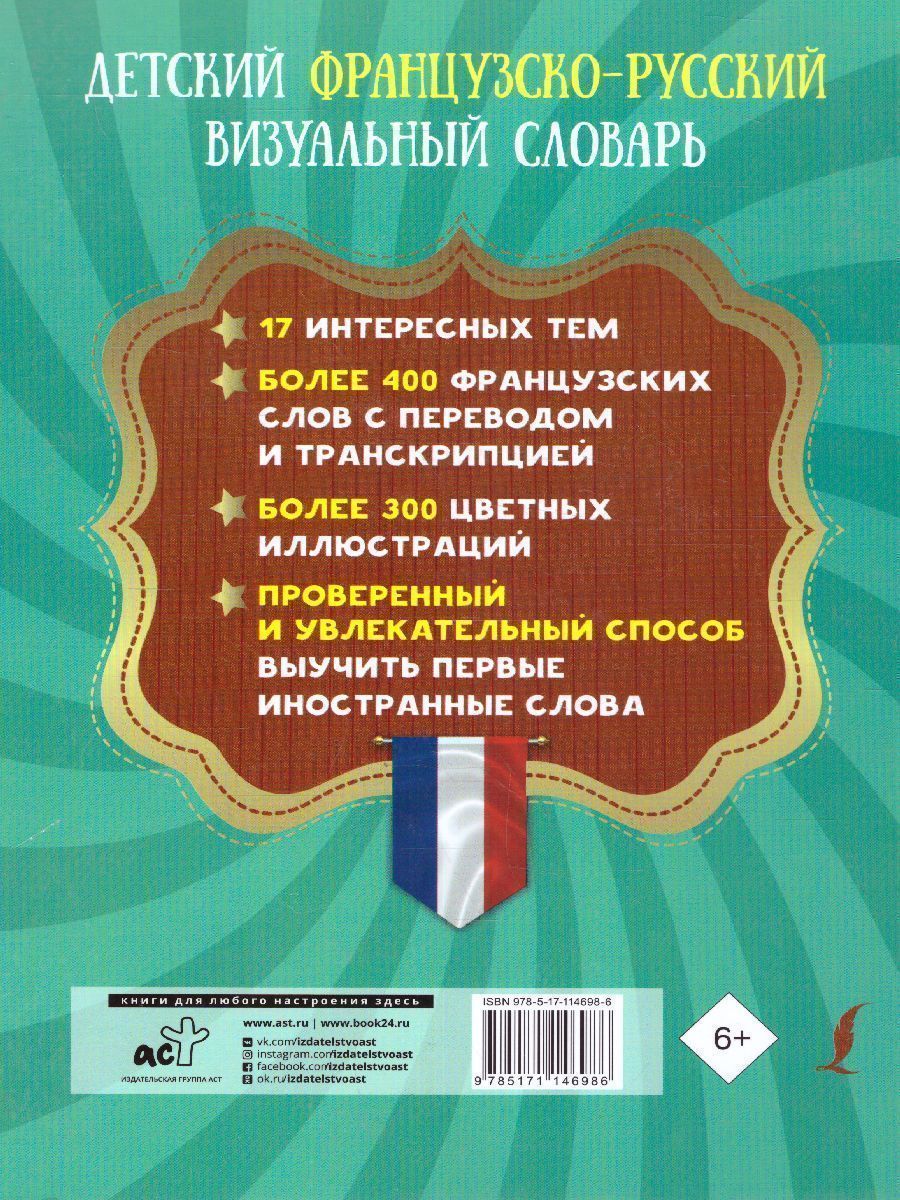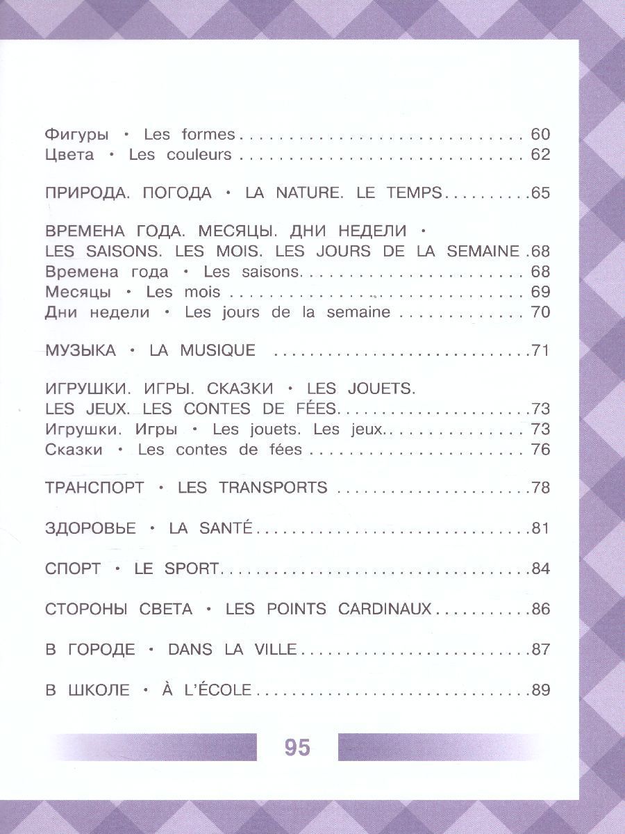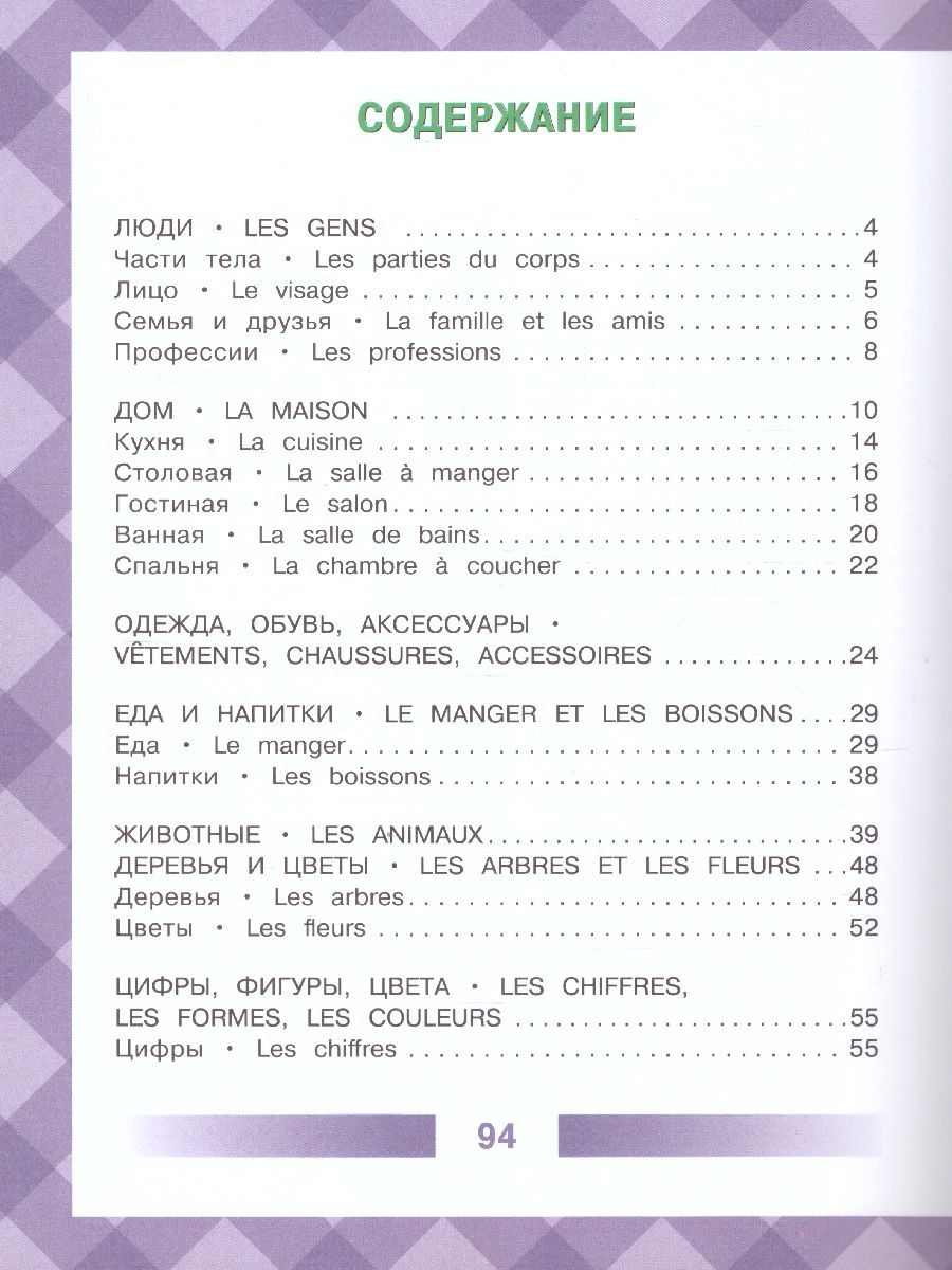 Книга представляет собой детский иллюстрированный тематический словарь, содержащий более 400 слов с переводом и транскрипцией русскими буквами. Словарь в первую очередь предназначается для занятий французским языком с детьми в возрасте от 4 до 6 лет, но также может быть полезен младшим школьникам.Характеристики