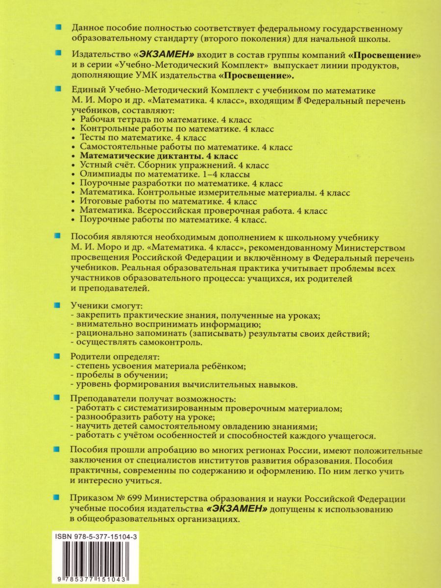 Данное пособие полностью соответствует федеральному государственному образовательному стандарту (второго поколения) для начальной школы. В нём представлены задания для проведения диктантов по основным темам курса математики 4 класса. Использование материалов пособия на уроке будет способствовать активизации мыслительной деятельности учащихся, развитию внимания и памяти. Пособие предназначено для педагогов начальной школы и родителей. Приказом № 729 Министерства образования и науки Российской Федерации учебные пособия издательства "Экзамен" допущены к использованию в общеобразовательных организациях. 3-е издание, переработанное и дополненное.Характеристики