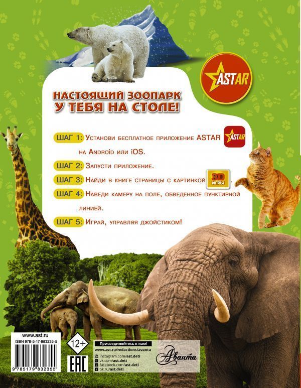 Животные: мохнатые, пернатые, чешуйчатые - вызывают у всех огромный интерес. Хотите узнать побольше о наших соседях по планете? Кто-то из них давно живет рядом с нами и хорошо нам знаком. А кто-то находится на грани вымирания и нуждается в нашей защите. Откройте страницы нашей энциклопедии — и вас поприветствует рычанием сам царь зверей — лев, а слон и носорог предложат принять участие в совместной прогулке, коммодский варан и королевская кобра попытаются напугать и даже укусить, а ящерицы и крокодил весело застучат хвостами. И все они предстанут перед вами в объеме и движении. Вам нужны лишь наша книга, смартфон или планшет с установленным бесплатным мобильным приложением ASTAR, и — желание окунуться в прекрасный мир животных. Наша удивительная энциклопедия с дополненной реальностью доставит вам немало приятных минут.Характеристики