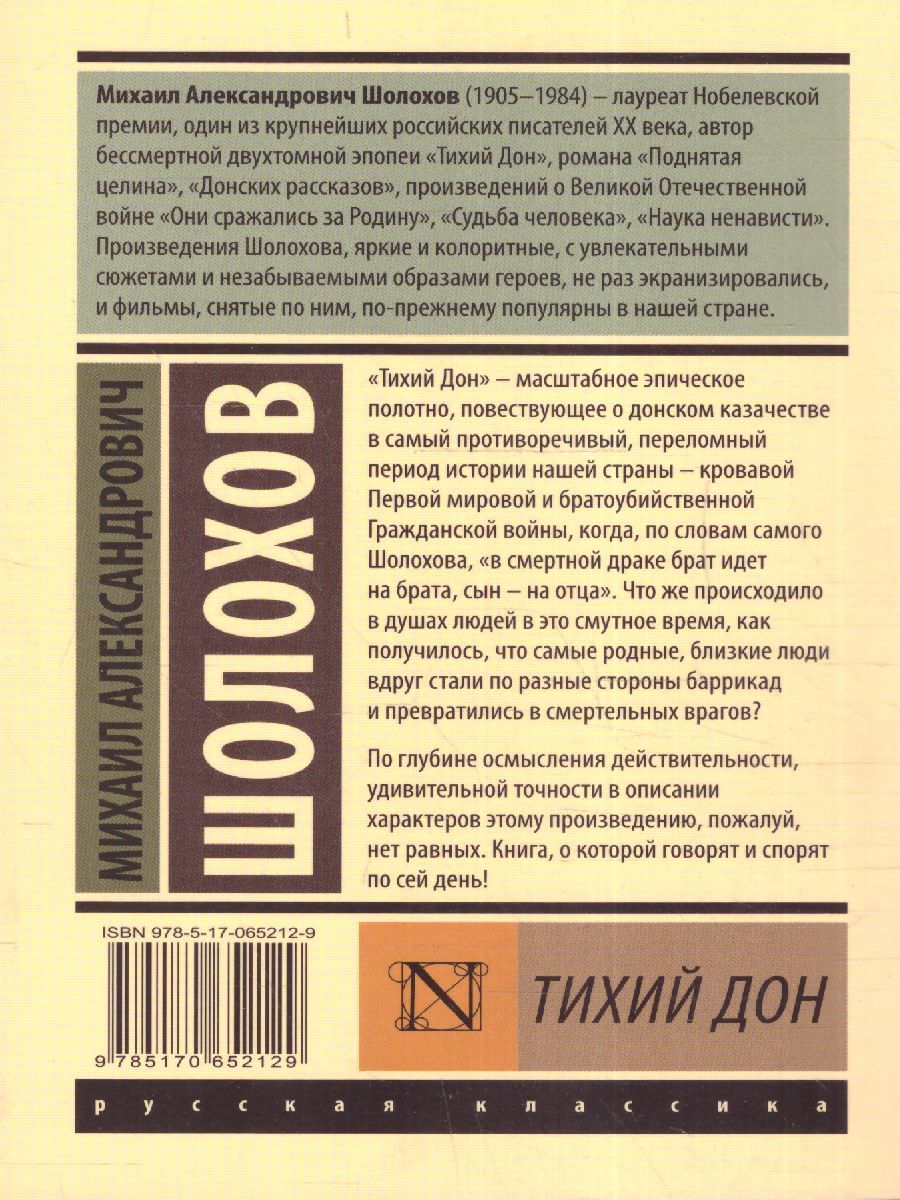 "Тихий Дон" – масштабное эпическое полотно, повествующее о донском казачестве в самый противоречивый, переломный период истории нашей страны – кровавой Первой мировой и братоубийственной Гражданской войны, когда, по словам самого Шолохова, "в смертной драке брат идет на брата, сын – на отца". Что же происходило в душах людей в это смутное время, как получилось, что самые родные, близкие люди вдруг стали по разные стороны баррикад и превратились в смертельных врагов? По глубине осмысления действительности, удивительной точности в описании характеров этому произведению, пожалуй, нет равных. Книга, о которой говорят и спорят по сей день!Характеристики