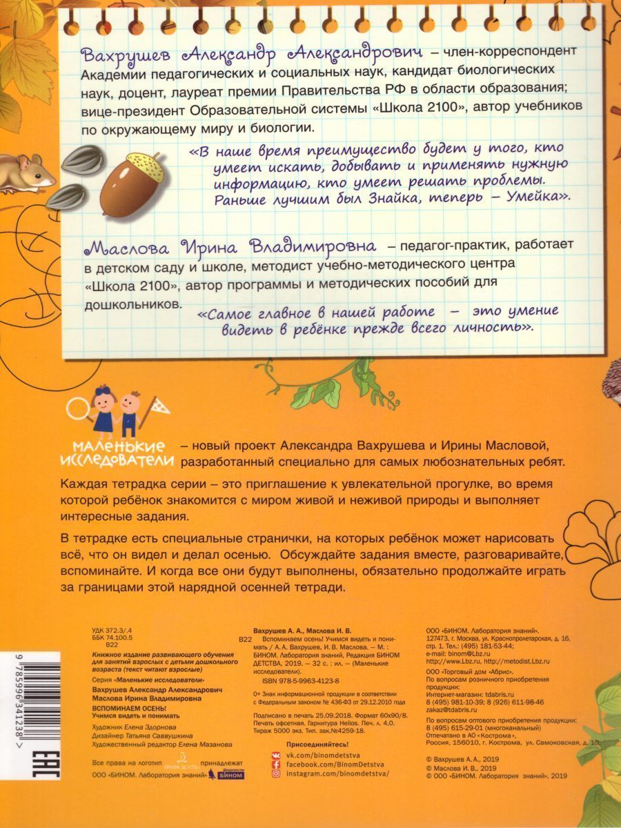 "Маленькие исследователи" - новый проект Александра Вахрушева и Ирины Масловой, разработанный специально для самых любознательных ребят. Каждая тетрадка - это приглашение к увлекательной прогулке, во время которой ребёнок знакомится с миром живой и неживой природы. Серию отличает выверенность заданий, их точное соответствие заявленному возрасту. Выполняя их, ребёнок совершает самые настоящие открытия. И всё это в игровой форме, как и должно быть в дошкольном детстве. Обсуждайте задания вместе, разговаривайте, вспоминайте. И когда все они будут выполнены, обязательно продолжайте игру в осень за границами этой нарядной тетради.Характеристики