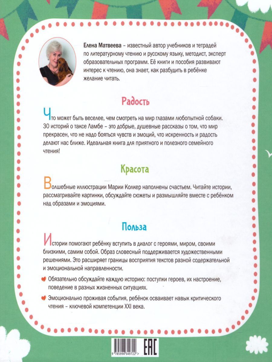 Что может быть веселее, чем смотреть на мир глазами любопытной собаки? Особенно, если это добрая и веселая такса Ламба. И 30 историй о ней — это то, что происходит с каждым малышом, когда он познаёт мир. По-настоящему хорошие книги — это не черные буквы на белой странице, а как раз это самое белое между черными знаками. В серии «Смысловое чтение» этого белого в изобилии. Эмоции, красота, секреты, открытия, волшебство и мечты, которые рождаются у каждого маленького читателя, когда он берет эти книги в руки. Как читать эту книгу? Очень важно эти истории обсуждать вместе с малышом. Именно такие короткие тексты и дополняющие их картинки помогают максимально точно и полно понять содержание, уловить детали и осмыслить информацию и идею текста. Вдумчиво читая и задавая вопросы, вы побуждаете ребёнка вступить в диалог с героям, миром, своими близкими и самим с собой. Обсуждая чувства и эмоции вместе с ребёнком, вы поможете ему сформировать очень важный навык критического чтения, который пригодится ему во взрослой жизни. Кто ее придумал? Автор книг Елена Матвеева — известный методист и эксперт образовательных программ, автор многих учебников и тетрадей по чтению и русскому языку. Поэтому её истории не только реалистичны (главная героиня рыжая такса живёт в её доме), но и полезны. Её книги и пособия развивают у детей интерес к чтению, и она точно знает, как разбудить в ребёнке желание читать! Красочные иллюстрации от Маши Колкер гармонично дополняют каждую историю. Они полезны для развития воображения и эстетического восприятия. А ещё они играют важную роль в обучении смысловому чтению — ребёнок учится соотносить прочитанное и изображённое на картинке, находить отличия, лучше понимать эмоциональную окраску текста. Книги в серии! Завести себя полезную рыжую таксу Ламбу может каждый! Она живет в книгах: - «Волшебный нос». - «Каждой таксе нужен дом». - «У самого синего моря». Читайте эти крошечные истории, рассматривайте задорные картинки, обсуждайте сюжеты и задавайте полезные для малыша вопросы! А для тех, чьи малыши ещё не научились читать самостоятельно, есть рабочие тетради Елены Матвеевой — «Читаем с удовольствием!». Это четыре тетради для рисования, размышлений, разговоров и чтения вслух. 5 причин купить: 1. Идеально подходит для первого чтения! 2. В одной книге — 30 историй про любопытную таксу. 3. Красочные иллюстрации на каждом развороте. 4. Развивает навык смыслового чтения и эмоциональный интеллект. 5. Елена Матвеева — опытный методист и автор учебников по русскому языку.Характеристики