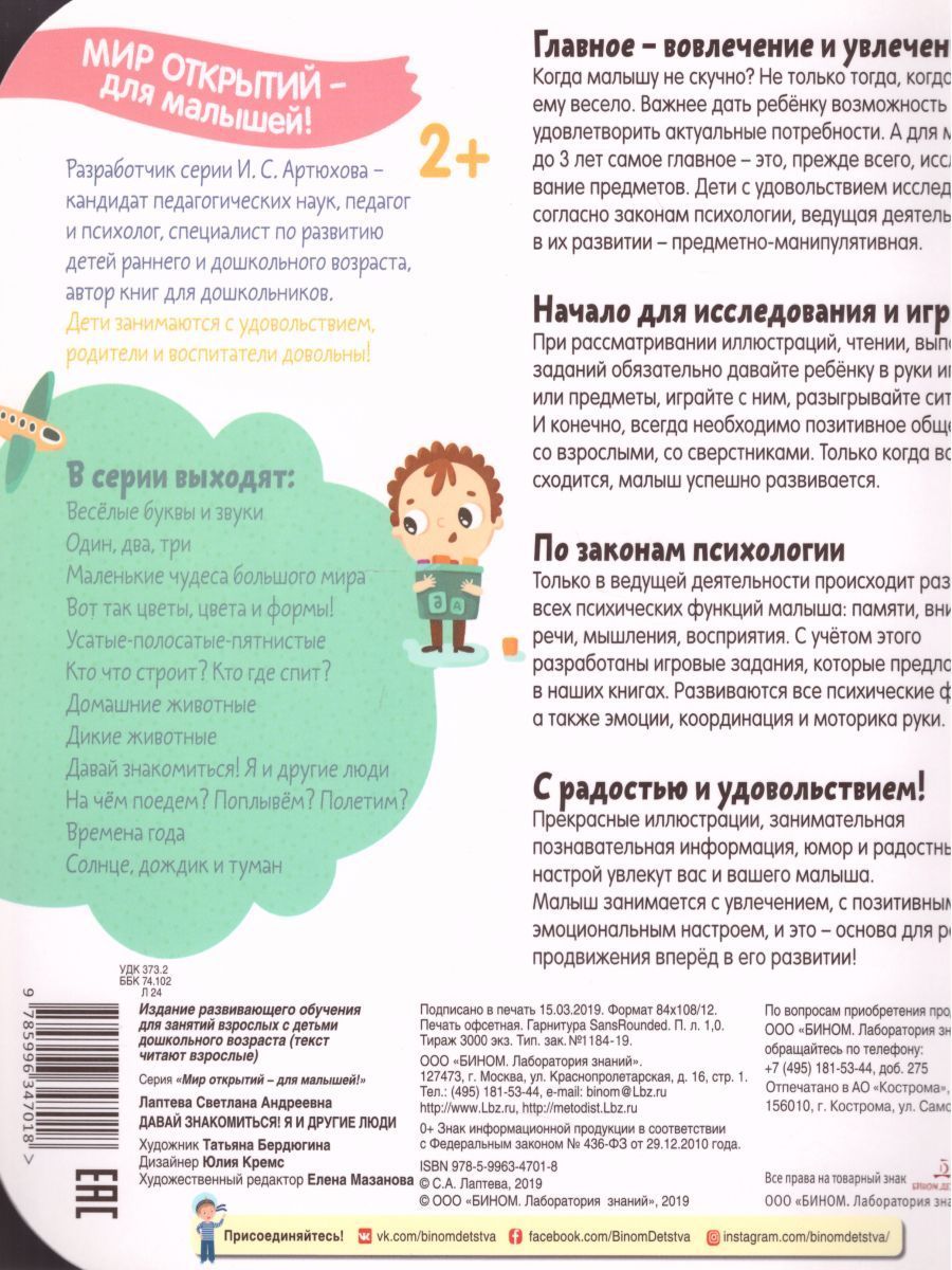 Главное - вовлечение и увлечение. Когда малышу не скучно? Не только тогда, когда ему весело. Важнее дать ребёнку возможность удовлетворить актуальные потребности. А для малыша до 3 лет самое главное - это, прежде всего, исследование предметов. Дети с удовольствием исследуют всё: согласно законам психологии, ведущая деятельность в их развитии - предметно-манипулятивная. Начало для исследования и игры. При рассматривании иллюстраций, чтении, выполнении заданий обязательно давайте ребёнку в руки игрушки или предметы, играйте с ним, разыгрывайте ситуации. И конечно, всегда необходимо позитивное общение: со взрослыми, со сверстниками. Только когда всё сходится, малыш успешно развивается. По законам психологии. Только в ведущей деятельности происходит развитие всех психических функций малыша: памяти, внимания, речи, мышления, восприятия. С учётом этого разработаны игровые задания, которые предлагаются в наших книгах. Развиваются все психические функции, а также эмоции, координация и моторика руки. С радостью и удовольствием! Прекрасные иллюстрации, занимательная познавательная информация, юмор и радостный настрой увлекут вас и вашего малыша. Малыш занимается с увлечением, с позитивным эмоциональным настроем, и это - основа для реального продвижения вперёд в его развитии! Для дошкольного возраста.Характеристики