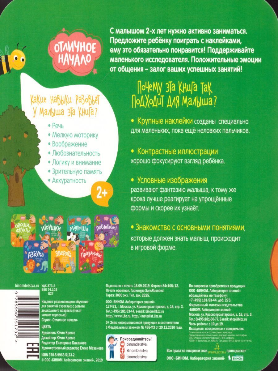 Что интересно малышу 2-х лет? Как начать заниматься с такой крохой? Это знает мама. Книжечки серии «Отличное начало» созданы такими мамами, которые знают, как удовлетворить любознательность маленького исследователя. Ведь мамы создавали это для своих малышей. Задания с яркими наклейками точно понравятся крохам. А положительные эмоции от картинок – это залог успешных занятий. ЧТО ВНУТРИ «Зелёный кузнечик, жёлтый одуванчик, красный снегирь» Узнаём, как раскрашен наш мир. Крупные, контрастные картинки хорошо фиксируют взгляд ребенка. А условные изображения развивают фантазию малыша. Кроха лучше реагирует на упрощённые формы и быстрее их узнаёт. Крупные наклейки созданы специально для маленьких пока ещё неловких пальчиков. О СЕРИИ «Отличное начало» — это первые уроки для малышей. Яркие картинки, большие наклейки помогают развить мелкую моторику, воображение, речь, любознательность, логику и внимание, зрительную память и аккуратность. ОБ АВТОРАХ Эту книгу специально для молодых мам создали сами молодые мамы современных малышей. 5 причин купить 1. Эта книжка, которую придумали молодые мамы для своих малышей. 2. Крупные картинки и шрифт — отлично подходят для первого знакомства со словами. 3. Круглые наклейки для каждой страницы: добавляют интерес и пользу занятиям. 4. Небольшой формат — удобно взять в дорогу или на прогулку. 5. Разработана молодыми мамами для современных малышей!Характеристики