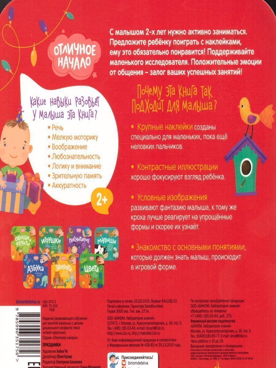 Что интересно малышу 2-х лет? Как начать заниматься с такой крохой? Это знает мама. Книжечки серии «Отличное начало» созданы такими мамами, которые знают, как удовлетворить любознательность маленького исследователя. Ведь мамы создавали это для своих малышей. Задания с яркими наклейками точно понравятся крохам. А положительные эмоции от картинок – это залог успешных занятий. ЧТО ВНУТРИ «День рождения, Мамин день, Праздник весны» Готовимся веселиться каждый день. Крупные, контрастные картинки хорошо фиксируют взгляд ребенка. А условные изображения развивают фантазию малыша. Кроха лучше реагирует на упрощённые формы и быстрее их узнаёт. Крупные наклейки созданы специально для маленьких пока ещё неловких пальчиков. О СЕРИИ «Отличное начало» — это первые уроки для малышей. Яркие картинки, большие наклейки помогают развить мелкую моторику, воображение, речь, любознательность, логику и внимание, зрительную память и аккуратность. ОБ АВТОРАХ Эту книгу специально для молодых мам создали сами молодые мамы современных малышей. 5 причин купить 1. Эта книжка, которую придумали молодые мамы для своих малышей. 2. Крупные картинки и шрифт — отлично подходят для первого знакомства со словами. 3. Круглые наклейки для каждой страницы: добавляют интерес и пользу занятиям. 4. Небольшой формат — удобно взять в дорогу или на прогулку. 5. Разработана молодыми мамами для современных малышей!Характеристики