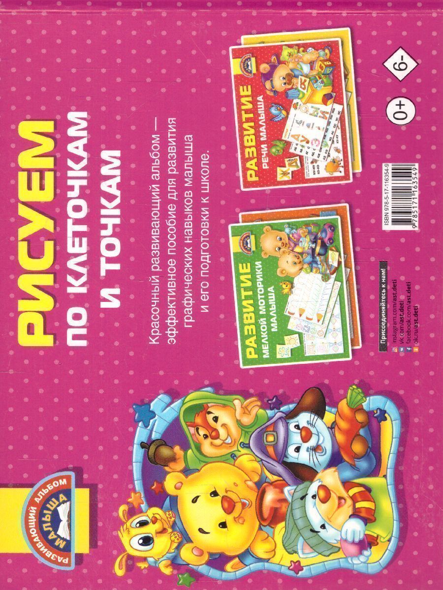 В альбоме "Рисуем по клеточкам и точкам" собраны задания и упражнения для развития графических навыков и подготовки руки к письму. Очень важно с раннего возраста развивать навыки, необходимые для овладения письмом. Рисование по клеточкам и точкам и выполнение заданий будет способствовать не только развитию мелкой моторики, а также внимания, памяти, речи, зрительно-двигательной координации и творческих способностей. Для дошкольного возрастаХарактеристики