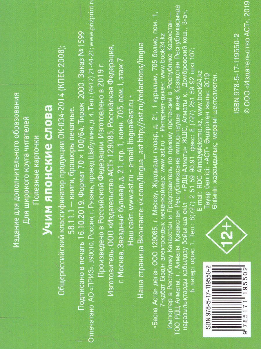 Полезные карточки "Учим японские слова" — это легкий способ выучить новые слова. Удобная форма: карточки со словами прикрепить куда угодно — на доску, на холодильник, на рабочий стол. Это поможет обращать внимание на то, что необходимо запомнить. Данная методика способствует многократному повторению материала. Занимайтесь японским языком в дороге, дома, на работе и на отдыхе!Характеристики