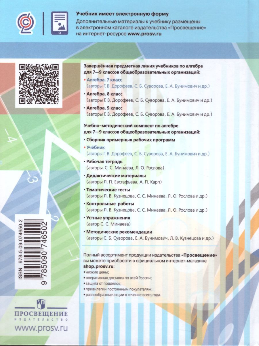Алгебра 7 класс. Учебник. Содержание учебника позволяет достичь планируемых результатов обучения, предусмотренных ФГОС основного общего образования. Учебный текст разбивается на смысловые фрагменты специальными знаками и завершается вопросами, позволяющими проверить, как понято прочитанное. В систему упражнений включены такие виды деятельности, как анализ информации, наблюдение и рассуждение, конструирование алгоритмов, поиск закономерностей, исследование и т. д. Всё это позволяет учащимся активно и осознанно овладевать универсальными учебными действиями. Каждая глава завершается разделом "Чему вы научились", помогающим ученику проверить себя на базовом уровне и оценить возможность выполнения более сложных заданий.Характеристики