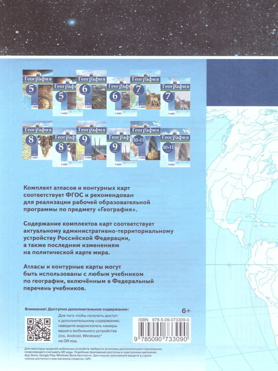 Комплект атласов и контурных карт соответствует ФГОС и рекомендован для реализации рабочей образовательной программы по предмету "География". Содержание комплектов карт соответствует актуальному административно-территориальному устройству Российской Федерации, а также последним изменениям на политической карте мира. Атласы и контурные карты могут быть использованы с любым учебником по географии, включенным в Федеральный перечень учебников.Характеристики