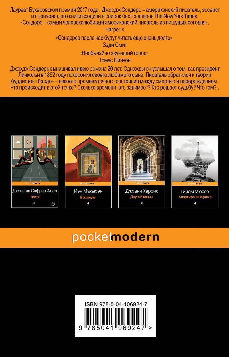 Роман-шедевр в прогрессивном жанре трансреализма: большая часть событий происходит в бардо — пограничном месте-состоянии между жизнью и смертью (в буддизме). Сондерс, блестящий мастер короткой формы, написал трагическую семейную историю со сверхъестественной атмосферой, преодолевая все жанровые условности. Наследник Эдгара По и Германа Мелвилла, Сондерс в "Линкольн в бардо" соединил поэтичность и исторические реалии, взяв за основу реальный случай с американским президентом и его маленьким сыном. Этот роман действительно перенесет вас за грань реальности.Характеристики