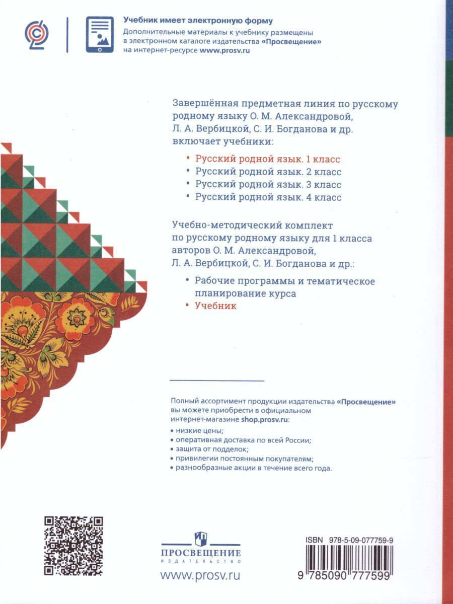 Русский родной язык 1 класс. Учебник.Учебник для 1-го класса по учебному предмету "Русский родной язык" предназначен для сопровождения и поддержки основного курса русского языка, обязательного для изучения во всех школах Российской Федерации. Работа с учебником позволит расширить представления о русском языке как духовной, нравственной и культурной ценности народа, развить познавательный интерес, любовь й уважительное отношение к русскому языку, а через него - к родной культуре. Особое внимание уделяется совершенствованию коммуникативных умений и культуры речи, обеспечивающих владение русским литературным языком в разных ситуациях его использования.Соответствует Федеральному государственному образовательному стандарту начального общего образования.Характеристики