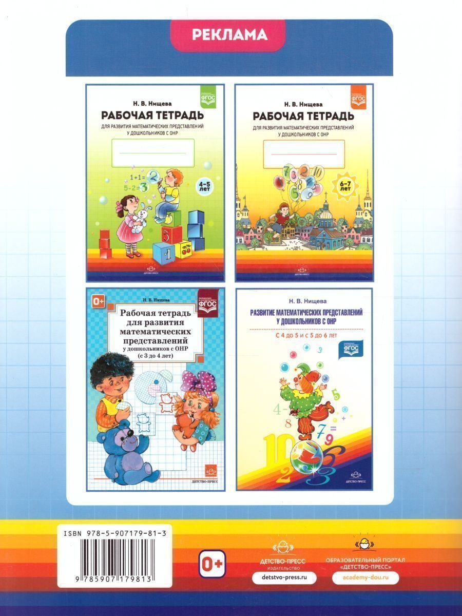 Рабочая тетрадь входит в методический комплект к пособию Н. В. Нищевой «Развитие математических представлений у дошкольников с ОНР (с 4 до 5 лет и с 5 до 6 лет)» и содержит игровые задания и упражнения для ознакомления с количественной моделью натурального ряда чисел, формирования навыка присчитывания по одному до заданного числа и счета двойками, сравнения предметов по длине, высоте, ширине, навыков ориентировки на плоскости, совершенствования умения узнавать и различать геометрические фигуры, что важно не только для познавательного, но и для речевого развития ребенка, так как создает фундамент для развития речи. Может использоваться как в работе с детьми с речевыми нарушениями, так и с детьми с нормальным речевым и интеллектуальным развитием. Рекомендовано педагогам ДОО и родителям дошкольников.Характеристики