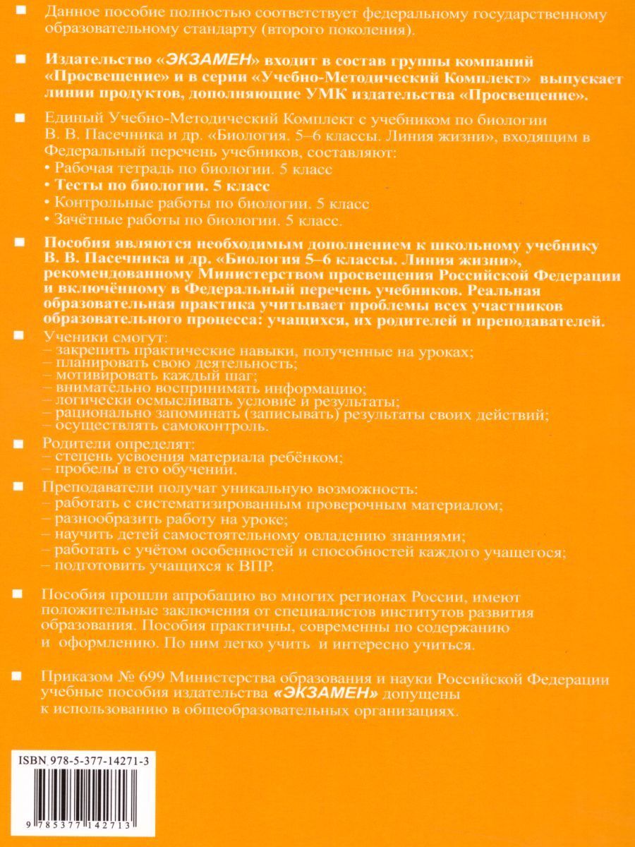 Данное пособие полностью соответствует федеральному государственному образовательному стандарту (второго поколения). Пособие предназначено для организации самостоятельной работы обучающихся общеобразовательных организаций, направленной на обобщение, закрепление и систематизацию знаний, полученных на учебных занятиях по биологии. Предлагаемые тесты представляют собой дидактическое дополнение к учебнику "Биология. 5-6 классы. Линия жизни" под редакцией В. В. Пасечника, изданному издательством "Просвещение". В издание включены тестовые задания трёх типов. Подобная структура тестовых заданий не только соответствует традиционным подходам к организации текущего, промежуточного и итогового контроля учебных достижений обучающихся, осваивающих основные общеобразовательные программы в соответствии с требованиями ФГОС, но и может быть рекомендована для организации подготовки школьников к различным интеллектуальным соревнованиям по биологии, в том числе к всероссийской олимпиаде школьников.Характеристики