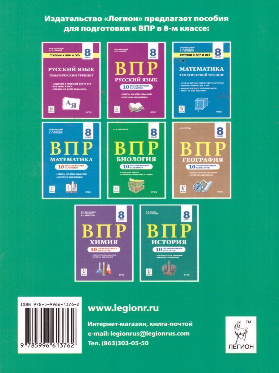 Пособие предназначено для подготовки к ВПР по обществознанию в 8-м классе. Книга содержит вариант работы с комментариями, а также 10 тренировочных вариантов, составленных по кодификатору и образцу ВПР, опубликованным на сайте ФИОКО в декабре 2019 года. В пособии даны развёрнутые ответы с критериями оценивания. Работая с нашей книгой, учителя ознакомятся с моделью ВПР в 8-м классе, описанием и системой оценивания, а также найдут в ней разнообразные авторские задания для работы на уроках обществознания. Восьмиклассники смогут потренироваться в выполнении заданий различного уровня сложности, а также повторить и систематизировать пройденный материал. Родители учеников получат возможность проконтролировать процесс подготовки детей к ВПР. Пособие предназначено учителям, учащимся 8-х классов и их родителям.Характеристики