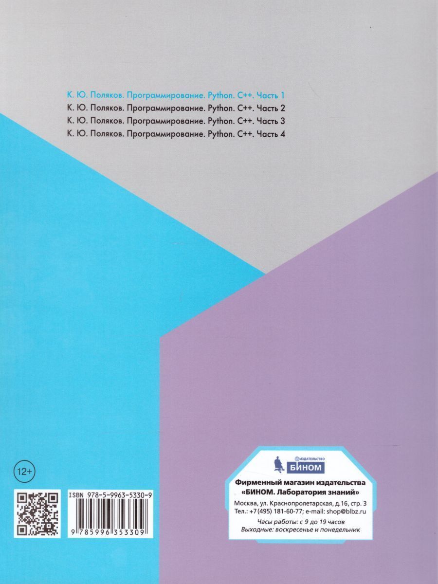 Книга представляет собой первую часть серии учебных пособий по программированию. В отличие от большинства аналогичных изданий, в ней представлены два языка программирования высокого уровня - Python и С++. В пособии рассматриваются основы программирования на выбранных языках: ввод и вывод данных, обработка целых и вещественных чисел, управляющие конструкции. Объяснение нового материала строится на примерах его практического применения. Изучаются приёмы разработки программ, использующих компьютерную графику и анимацию. После каждого параграфа приводится большое число заданий для самостоятельного выполнения разной сложности и вариантов проектных работ. Пособие предназначено для школьников, начинающих изучать программирование. Рекомендуем!Характеристики