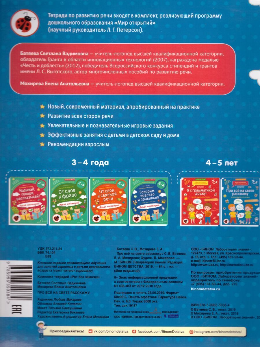 Комплект тетрадей "Рот без замочка" разработан специально для программы дошкольного образования "Мир открытий". Светлана Батяева и Елена Мохирева - практикующие логопеды. Их тетради — это результат каждодневной работы с детьми, поэтому в них мало скуки, а много игры, интересных идей и заданий, фантазии. Комплект рассчитан на целый год занятий с малышами 4-5 лет. Тетради соответствуют требованиям ФГОС дошкольного образования, заниматься по ним можно как в детском саду, так и дома. Наши тетради - рабочие! Это значит, что в них можно и нужно (!) рисовать, раскрашивать, приклеивать многоразовые наклейки, что всегда нравится детям. Но самое главное - все задания легко превращаются в настоящие живые игры за границами тетрадей! На прогулке в парке и дома на кухне, в магазине и детском кафе. С мячом, с тетрадкой и карандашами, с игрушками, одеждой, кастрюльками и сковородками. Играйте и говорите, общайтесь, обсуждайте всё, что видите вокруг, слушайте внимательно, будьте вместе со своими любимыми малышами.Характеристики
