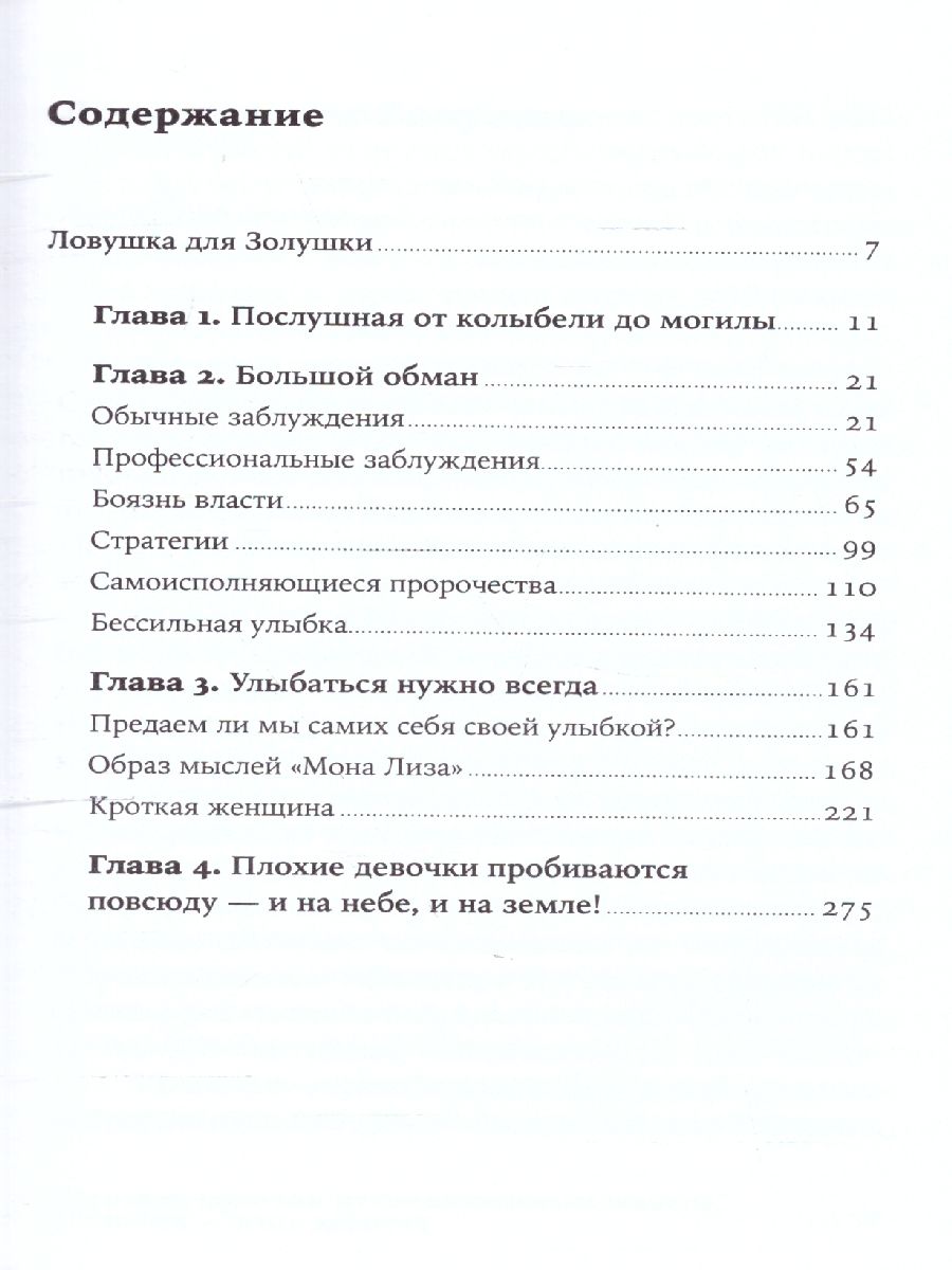 Женщинам с раннего детства внушают, что они должны быть «хорошими». Их главное предназначение в жизни – быть хорошей матерью и женой. Со всем остальным справятся мужчины. И женщины, сами того не осознавая, становятся зависимыми. Они отказываются от своих истинных желаний и устремлений в угоду интересов своих близких. Главное — быть покладистой и желанной. Эта цель заслоняет собой огромное количество возможностей. Женщина ограничивает себя в самоопределении, независимости, карьере и во власти. Вместо того чтобы искать себя, она старается понравиться окружающим. «К Золушке пришел успех тогда, когда она перестала быть послушной и пассивной». Автор этой книги, рассказав множество жизненных историй, доказывает: кроткие и покорные женщины, отказавшись ради семьи и детей от образования, карьеры и вообще какого-либо развития, теряют свою индивидуальность и становятся неинтересными своим партнерам. Пора уже очнуться и сказать себе: «Я у себя одна. Чего я хочу на самом деле? Что чувствую? Куда иду?», — стать независимой личностью, начать реализовывать свой творческий потенциал и двигаться к новым свершениям. Автор разрушает устоявшиеся в нашем обществе стереотипы, которые довлеют над женщинами и не дают им реализовывать свой творческий, профессиональный потенциал в полной мере. Книга позволяет взглянуть на себя по-новому и понять, почему не всегда стоит быть «хорошей девочкой». Почему не стоит бояться проявления своей агрессии, недовольства. А порой даже полезно выяснять отношения с близкими.Книга содержит множество советов о том, как женщине правильно выстраивать отношения со своим партнером, как вести себя с подчиненными.Все свои идеи автор иллюстрирует на конкретных примерах из жизни.«Есть женщины, которые живут в согласии с собой! Они нашли равновесие между своими желаниями и требованиями окружающих. Они чаще рискуют. Они идут по своему пути, не отвлекаясь на размышления о том, что думают о них другие. И еще — они верят в свои способности!»Характеристики