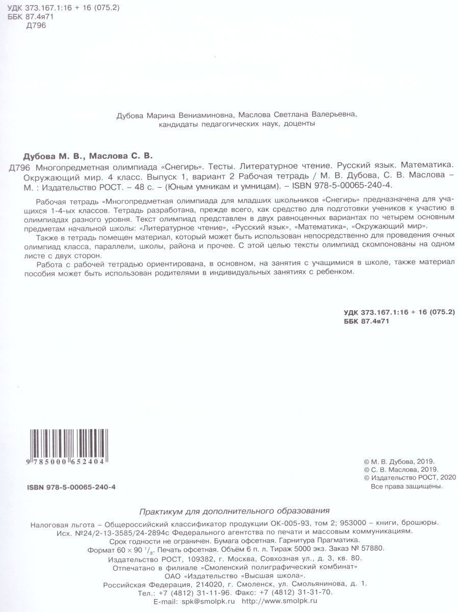 Рабочая тетрадь "Многопредметная олимпиада для младших школьников "Снегирь" предназначена для учащихся 1-4-ых классов. Тетрадь разработана, прежде всего, как средство для подготовки учеников к участию в олимпиадах разного уровня. Текст олимпиад представлен в двух равноценных вариантах по четырем основным предметам начальной школы: "Литературное чтение", "Русский язык", "Математика", "Окружающий мир". Также в тетрадь помещен материал, который может быть использован непосредственно для проведения очных олимпиад класса, параллели, школы, района и прочее. С этой целью тексты олимпиад скомпонованы на одном листе с двух сторон. Работа с рабочей тетрадью ориентирована, в основном, на занятия с учащимися в школе, также материал пособия может быть использован родителями в индивидуальных занятиях с ребенком. Издание-перевертыш.Характеристики
