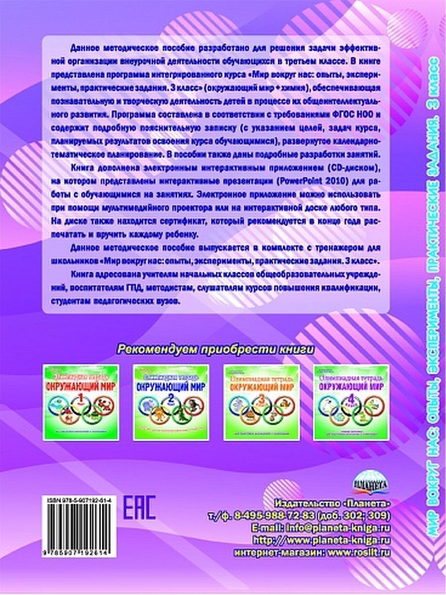 Данное методическое пособие разработано для решения задачи эффективной организации внеурочной деятельности обучающихся в третьем классе. В книге представлена программа интегрированного курса «Мир вокруг нас: опыты, эксперименты, практические задания. 3 класс» (окружающий мир + химия), обеспечивающая познавательную и творческую деятельность детей в процессе их общеинтеллектуального развития. Программа составлена в соответствии с требованиями ФГОС НОО и содержит подробную пояснительную записку (с указанием целей, задач курса, планируемых результатов освоения курса обучающимися), развернутое календарно-тематическое планирование. В пособии также даны подробные разработки занятий. Книга дополнена электронным интерактивным приложением (CD-диском), на котором представлены интерактивные презентации (Power-Point 2010) для работы с обучающимися на занятиях. Электронное приложение можно использовать при помощи мультимедийного проектора или на интерактивной доске любого типа. На диске также находится сертификат, который рекомендуется в конце года распечатать и вручить каждому ребенку. Данное методическое пособие выпускается в комплекте с тренажером для школьников «Мир вокруг нас: опыты, эксперименты, практические задания. 3 класс». Книга адресована учителям начальных классов общеобразовательных учреждений, воспитателям ГПД, методистам, слушателям курсов повышения квалификации, студентам педагогических вузов.Характеристики