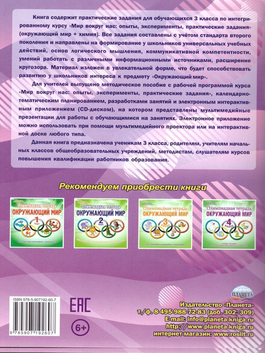 Книга содержит практические задания для обучающихся 3 класса по интегрированному курсу «Мир вокруг нас: опыты, эксперименты, практические задания» (окружающий мир + химия). Все задания составлены с учётом стандарта второго поколения и направлены на формирование у школьников универсальных учебных действий, основ логического мышления, коммуникативной компетентности, умений работать с различными информационными источниками, расширение кругозора. Материал изложен в увлекательной форме, что будет способствовать развитию у школьников интереса к предмету «Окружающий мир». Для учителей выпущено методическое пособие с рабочей программой курса «Мир вокруг нас: опыты, эксперименты, практические задания», календарно-тематическим планированием, разработками занятий и электронным интерактивным приложением (CD-диском), на котором представлены мультимедийные презентации для работы с обучающимися на занятиях. Элек-тронное приложение можно использовать при помощи мультимедийного проектора или на ин-терактивной доске любого типа. Данная книга предназначена ученикам 3 класса, родителям, учителям начальных классов общеобразовательных учреждений, методистам, слушателям курсов повышения квалификации работников образования.Характеристики