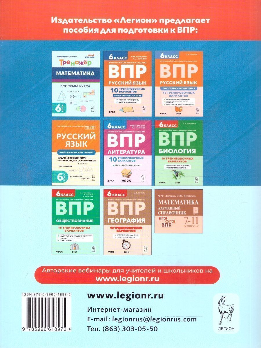 Пособие предназначено для подготовки к всероссийской проверочной работе по математике в 6-м классе. Книга содержит: • 10 тренировочных вариантов в формате ВПР; • инструкцию для школьников; • ответы ко всем заданиям и критерии их оценивания. Варианты соответствуют спецификации и демоверсии проверочной работы, размещённым на сайте Федерального института оценки качества образования. Пособие адресовано учителям, учащимся 6-х классов и их родителям.Характеристики