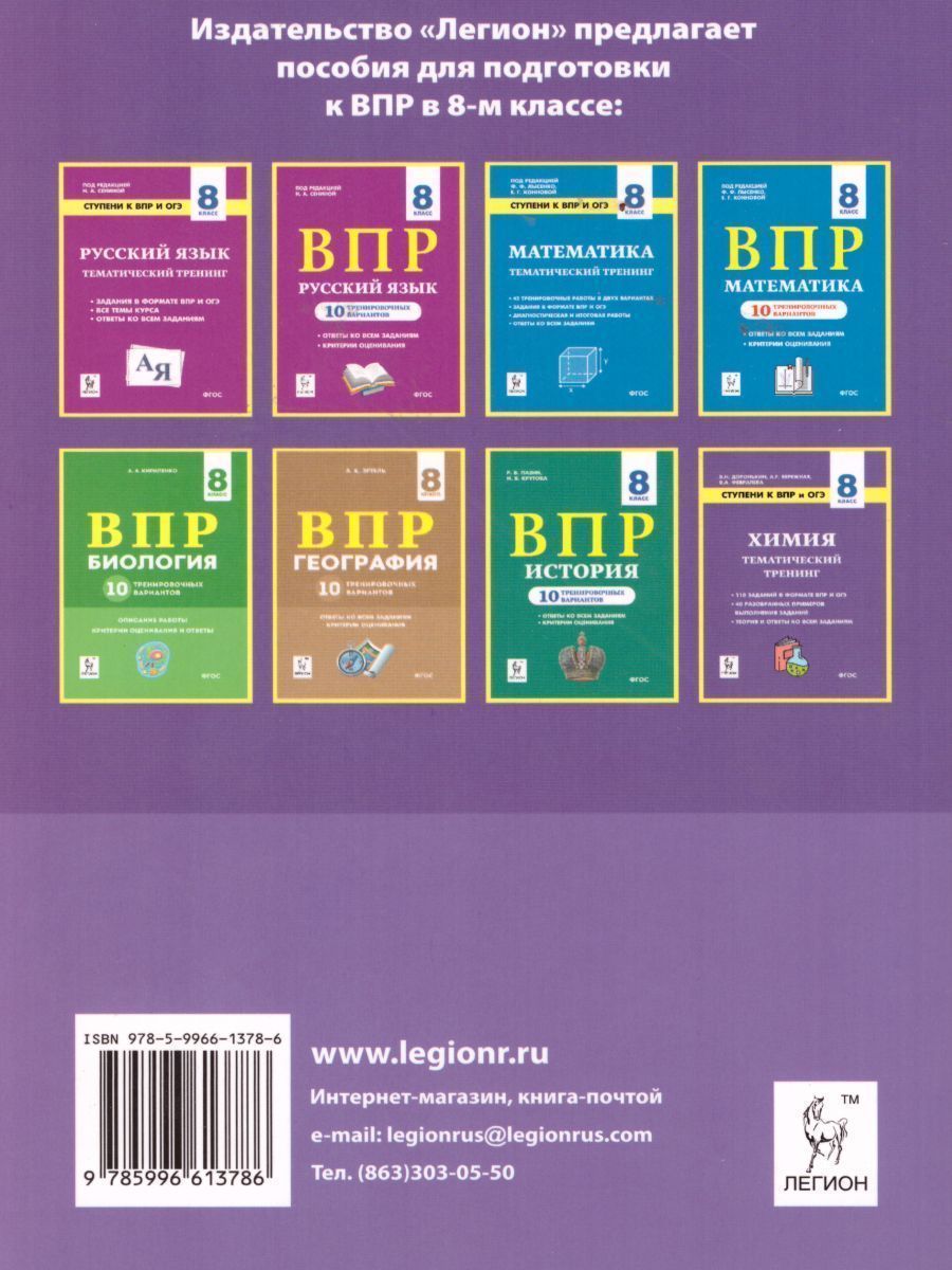 Пособие предназначено для подготовки к ВПР по химии в 8-м классе. Работая с ним, школьники научатся выполнять задания, которые включены в ВПР, и получат дополнительные навыки решения задач. Книга содержит 10 вариантов, составленных по плану и образцу, размещённым 15.01.2020 на сайте. Их решение подробно разбирается в конце книги. В решении заданий первого варианта приводится также необходимая для выполнения базовая теория и показывается алгоритм поиска решения. Учитель может использовать это пособие для подготовки учащихся к выполнению ВПР по химии и организации уроков в рамках текущего образовательного процесса.Характеристики