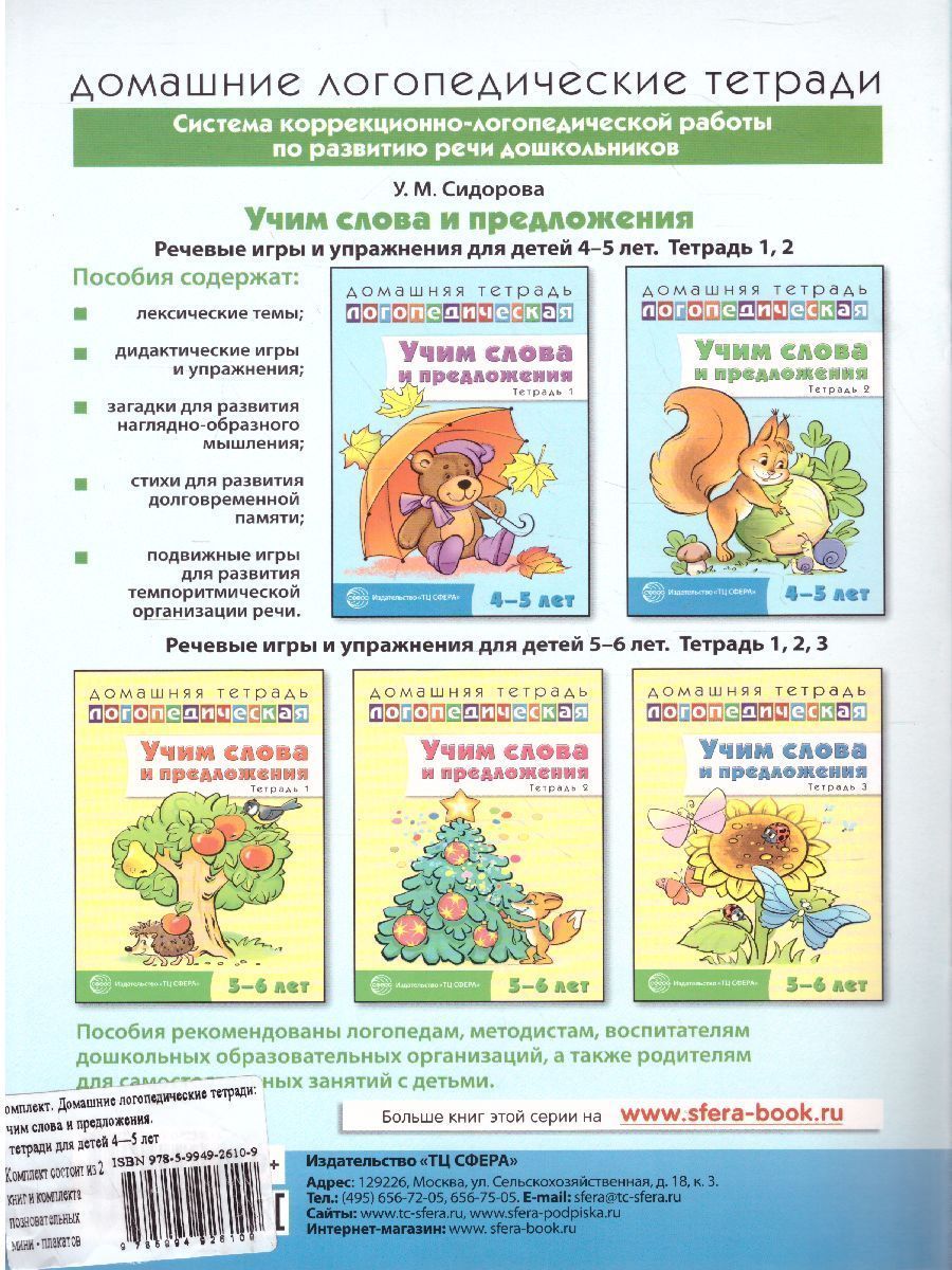 Комплект состоит из: 1. Домашняя логопедическая тетрадь: Учим слова и предложения. Для детей 4—5 лет. Тетрадь 1. 2. Домашняя логопедическая тетрадь: Учим слова и предложения. Для детей 4—5 лет. Тетрадь 2. Тетради по развитию речи для детей средней группы содержат материал по лексическим темам, направленный на развитие лексико-грамматического строя речи дошкольников 4—5 лет. Система логопедической работы построена на основе 16 лексических тем с учетом особенностей детей этого возраста. С помощью игр и упражнений устраняются трудности в формировании лексического запаса и усвоении грамматических категорий. Пальчиковая гимнастика и игры помогают формированию двигательной активности, темпа, ритма речи, развитию мелкой и речевой моторики, коррекции психических процессов, способствуют развитию речи в целом. Пособие рекомендовано логопедам, методистам и педагогам дошкольных организаций как для работы в детском саду, так и для самостоятельных занятий с детьми в домашних условиях.Характеристики