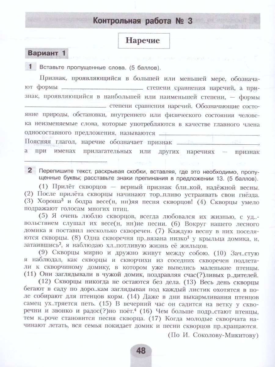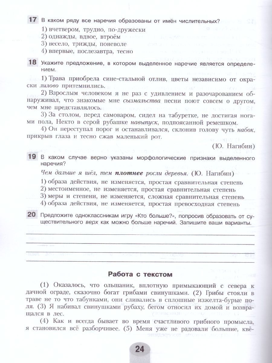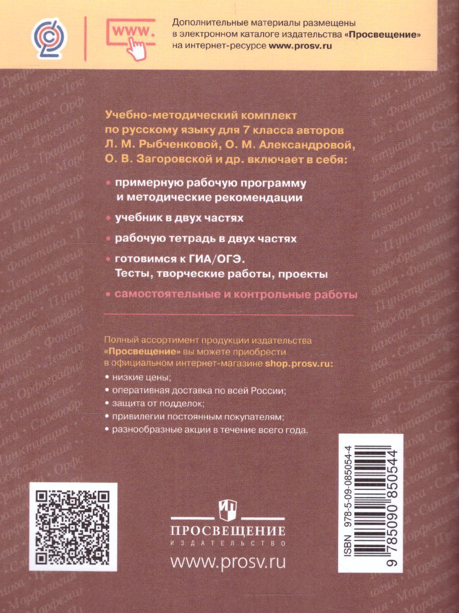 Учебное пособие входит в УМК по русскому языку для 7 класса авторов Л. М. Рыбченковой, О. М. Александровой, О. В. Загоровской и др. Оно поможет ученикам проверить и закрепить знания, полученные на уроках, и подготовиться к промежуточной аттестации в форме Всероссийской проверочной работы. Разнообразие представленных заданий способствует совершенствованию орфографической и пунктуационной зоркости, закрепляет навыки выполнения различных видов разбора. Также данное пособие содержит ответы (ключи) к самостоятельным и контрольным работам.Характеристики