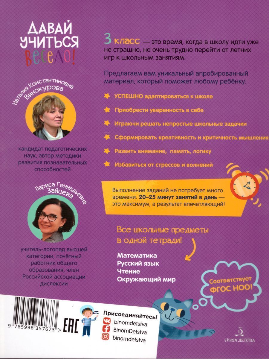 Начало учебного года - это время, когда очень трудно перейти от летних игр к школьным занятиям. Предлагаем уникальный апробированный материал, который поможет любому ребёнку УСПЕШНО АДАПТИРОВАТЬСЯ К ШКОЛЕ. А еще приобрести уверенность в себе, развить внимание, память, логику, а также избавиться от стрессов и волнений. Ребенок перестанет воспринимать школьную программу как что-то особенное и сложное. Ведь задания в тетрадках отличаются от учебных только формой подачи материала, а не содержанием. Они полностью соответствуют школьной программе, а игровые методики превращают их в увлекательную игру. Всего в комплекте 3 тетради – по одной на каждый класс. Заниматься можно как в течение учебного года, так и летом, когда надо повторить пройденный материал. Выполнение заданий не потребует много времени: 20-25 минут в день. Все школьные предметы в одной тетради! Математика. Русский язык. Чтение. Окружающий мир. С этой тетрадью учёба для ребенка станет не нудной обязанностью, а радостью, а у вас не будет поводов расстраиваться насчет его успеваемости! Успехов вам и больше веры в себя и возможности своего ребёнка!Характеристики